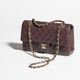 Made in Italy, this medium double flap chain shoulder bag was fashioned from burgundy lambskin leather, finished with a diamond quilt. It features a leather shoulder strap, adorned with a silver-tone chain, and a main foldover top that is closed by a CC turnlock. As it opens, it leads to a second, smaller flap, fastened by a snap button. It presents us to a luxurious bordeaux red interior, embellished with a stitched logo and a classic logo stamp. The compartment has two slip pockets and an internal logo stamp. Functional, the accessory displays a front slip pocket, hidden under the double flaps, and another one open on the back.