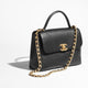 This is an authentic CHANEL Calfskin Quilted Small Gold Top Handle Flap in Black. This chic tote is crafted of diamond-quilted grained calfskin leather in black. The shoulder bag features a sturdy top handle with aged gold detailing, a leather-threaded chain-link shoulder strap with a shoulder pad, a rear patch pocket, and an aged gold CC turn lock. This opens the flap to a partitioned black fabric interior with a zipper pocket.