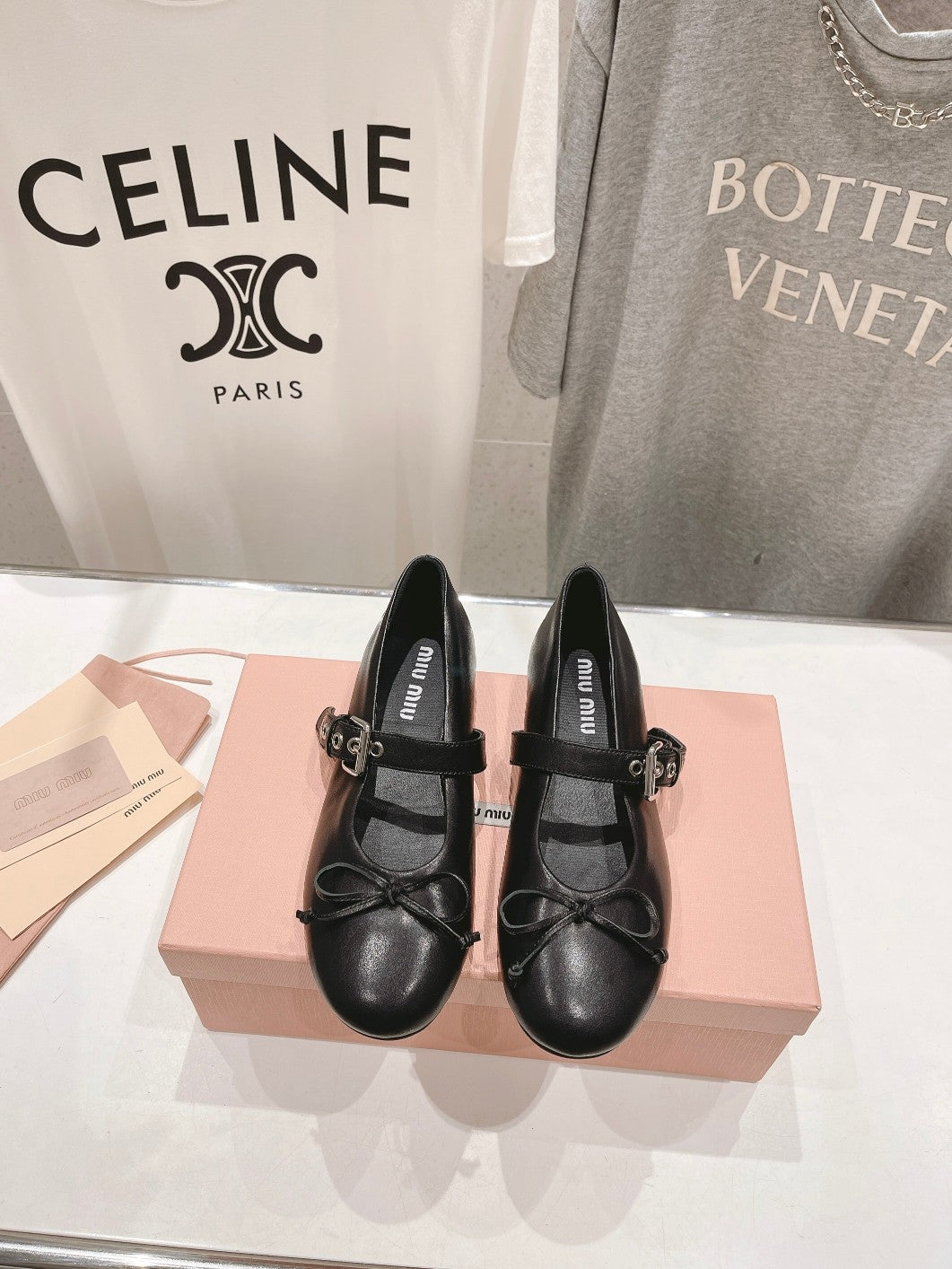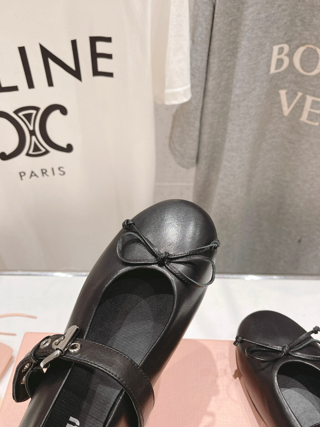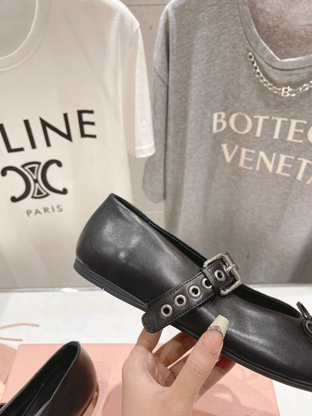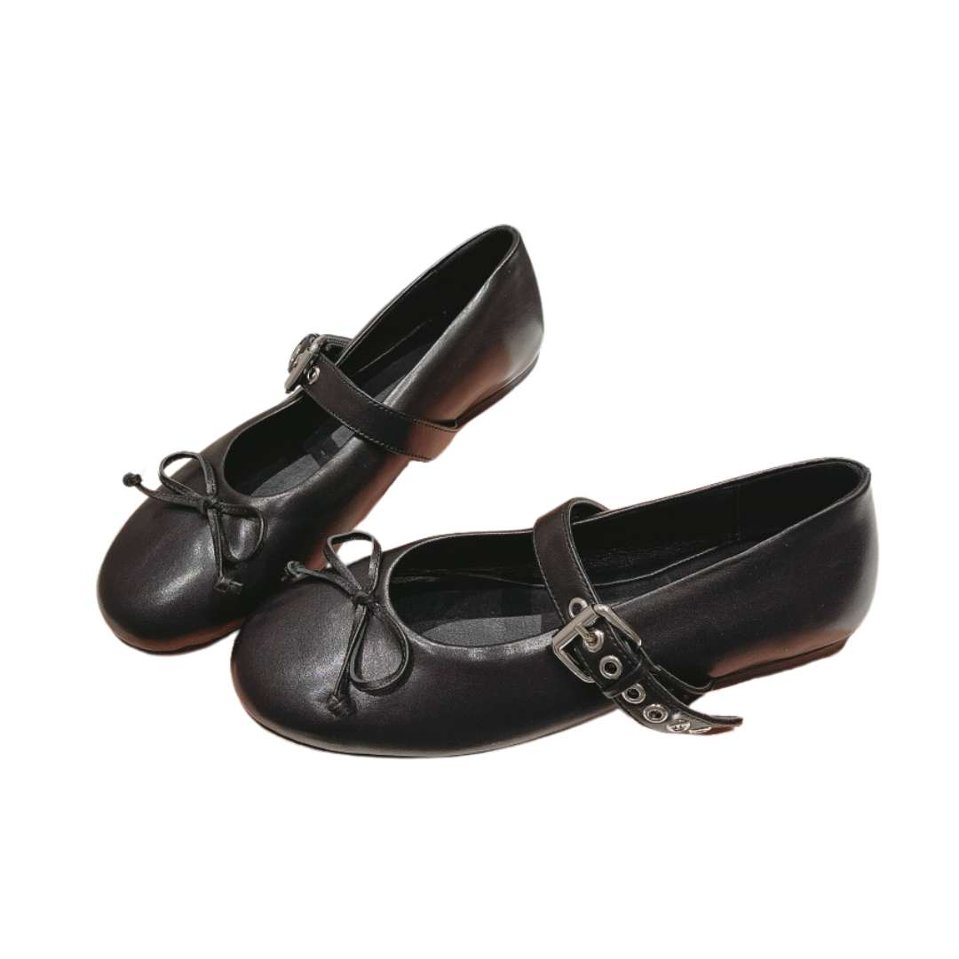Black ballerina from elegant and flat shiny leather with a ribbon decorated with metal rings and a decorated with a fonka.