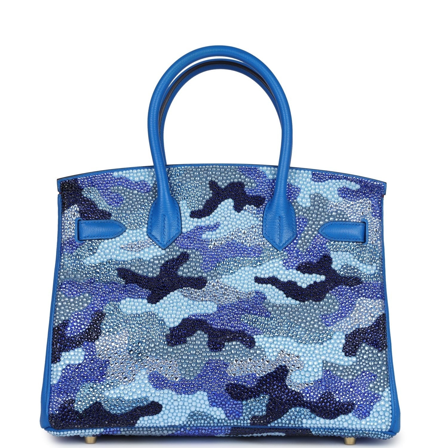 Custom Camouflage Swarovski Crystal Hermès Birkin 30 Bleu Hydra Chevre Gold Hardware