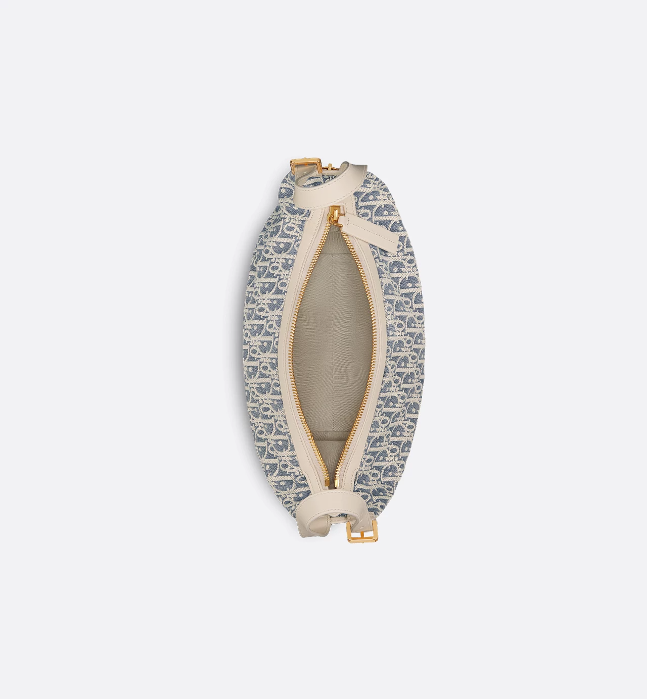 The D-Journey bag offers a new take on the hobo silhouette with a modern supple design. The style elegantly combines light biscuit smooth calfskin with blue chambray — a lightweight cotton denim embroidered with ultra-durable raffia thread forming the iconic Dior Oblique motif. The main compartment is completed by a zip pocket, while two decorative side pockets showcase a large leather pull with the Christian Dior Paris signature. Featuring adjustable leather top handles and a leather strap, D-Journey bag can be carried by hand, worn over the shoulder or crossbody as a daily companion.