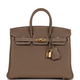 This Birkin is in Etoupe togo leather with gold hardware and has contrast stitching, front flap, two straps with center toggle closure, clochette with lock and two keys, and double rolled handles.