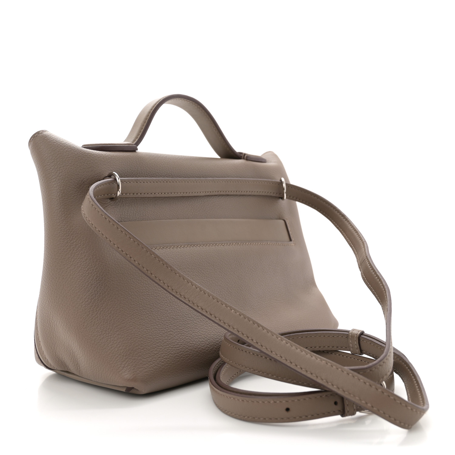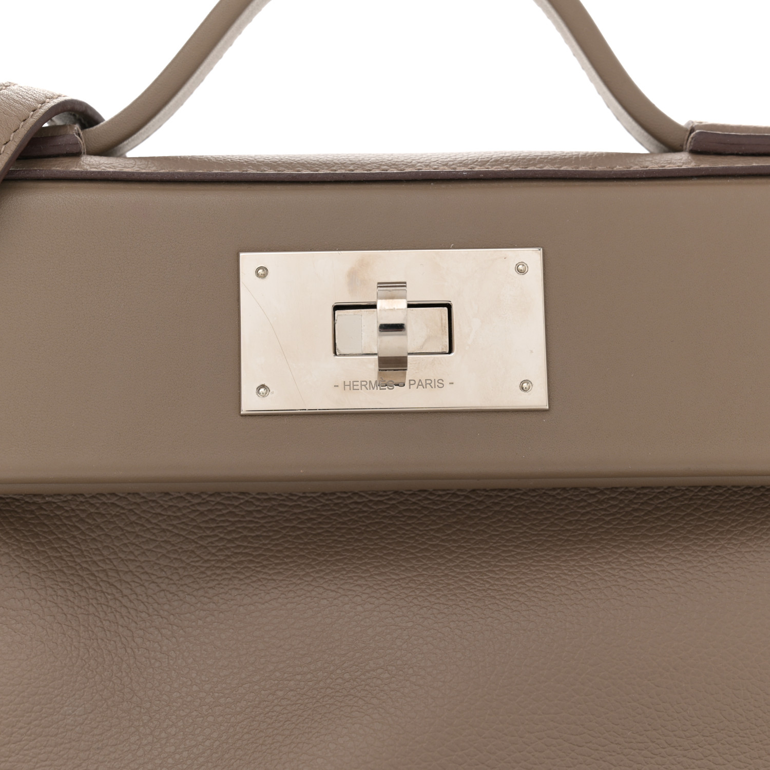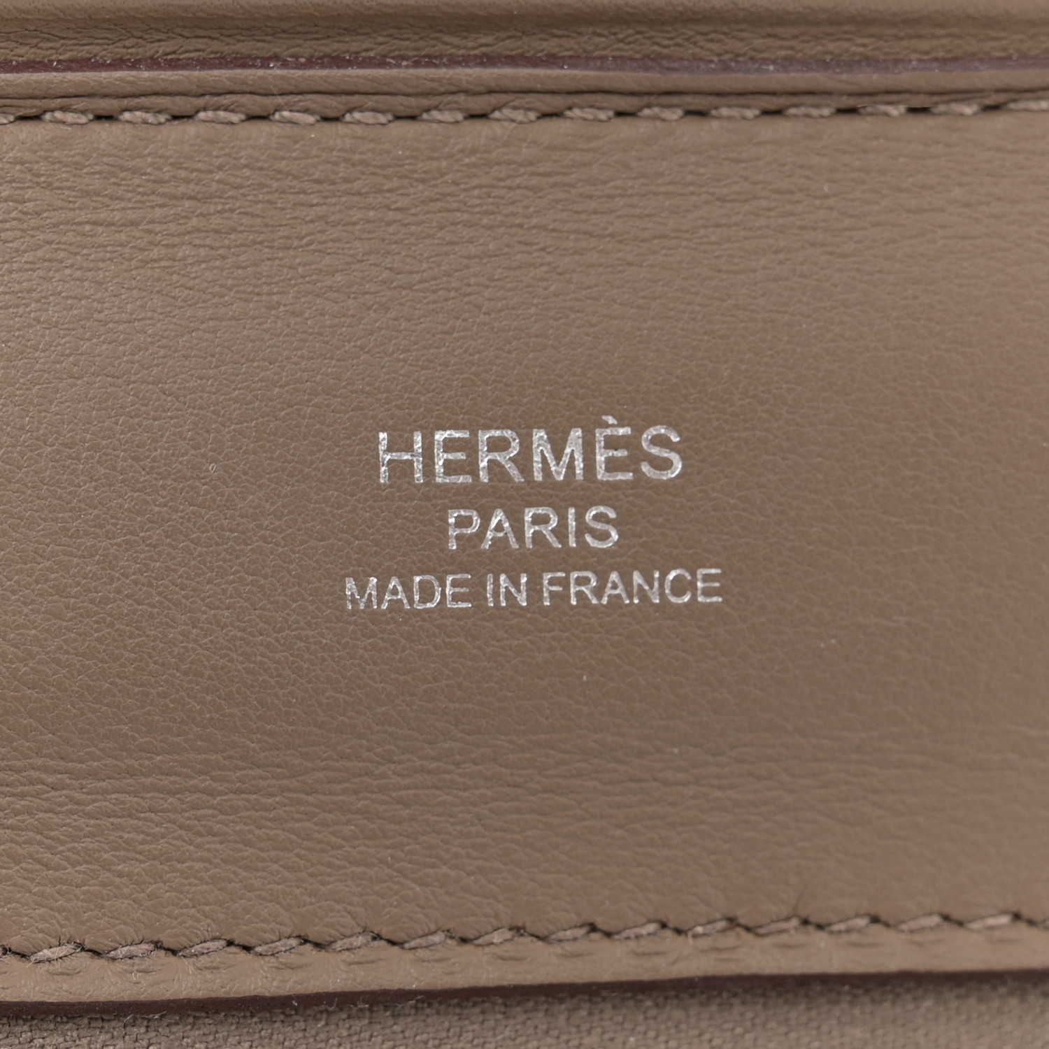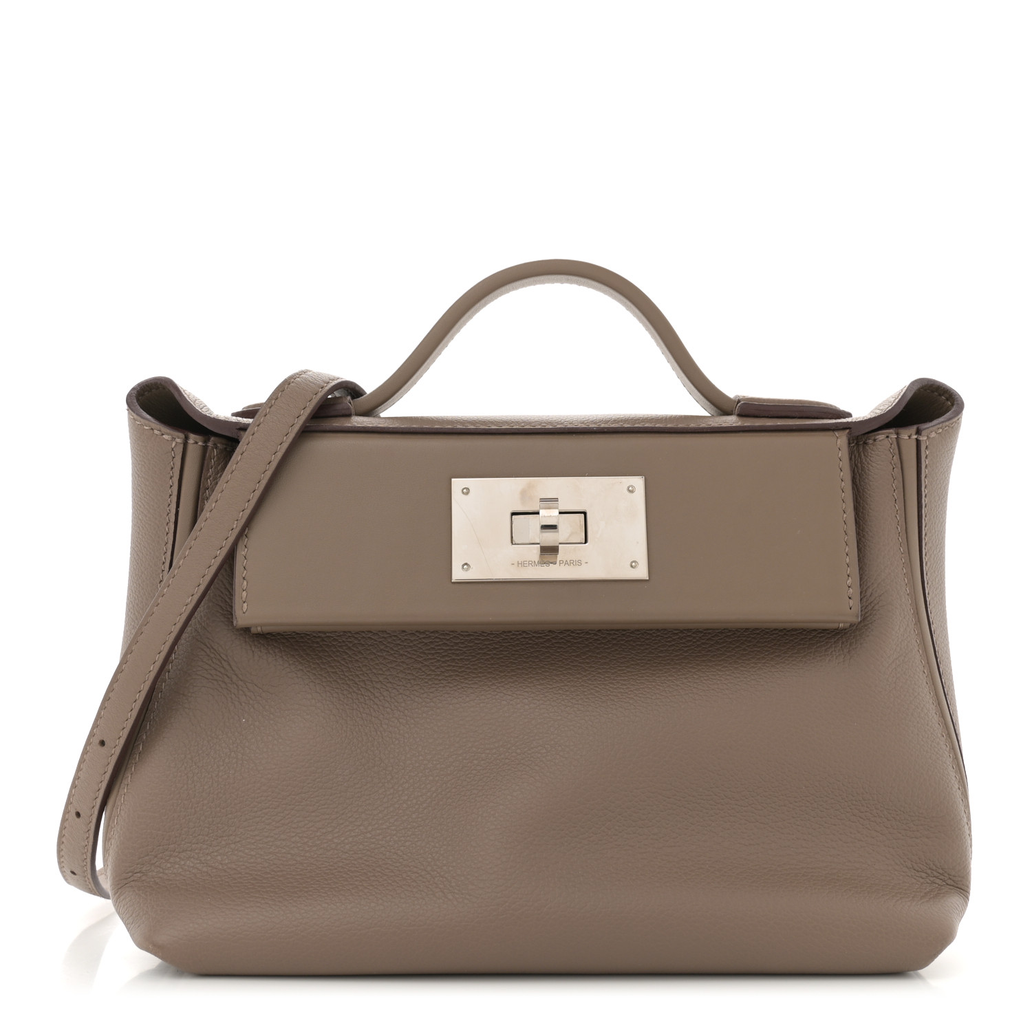 This is an authentic HERMES Evercolor Swift 24/24 21 in Etoupe. This handbag is crafted of richly textured evercolor and swift leather in beige. The bag features a reinforced leather top handle, an optional leather shoulder strap, and palladium hardware. This bag can also be styled as a belt bag. The flap opens to a matching smooth leather interior with a zipper pocket.