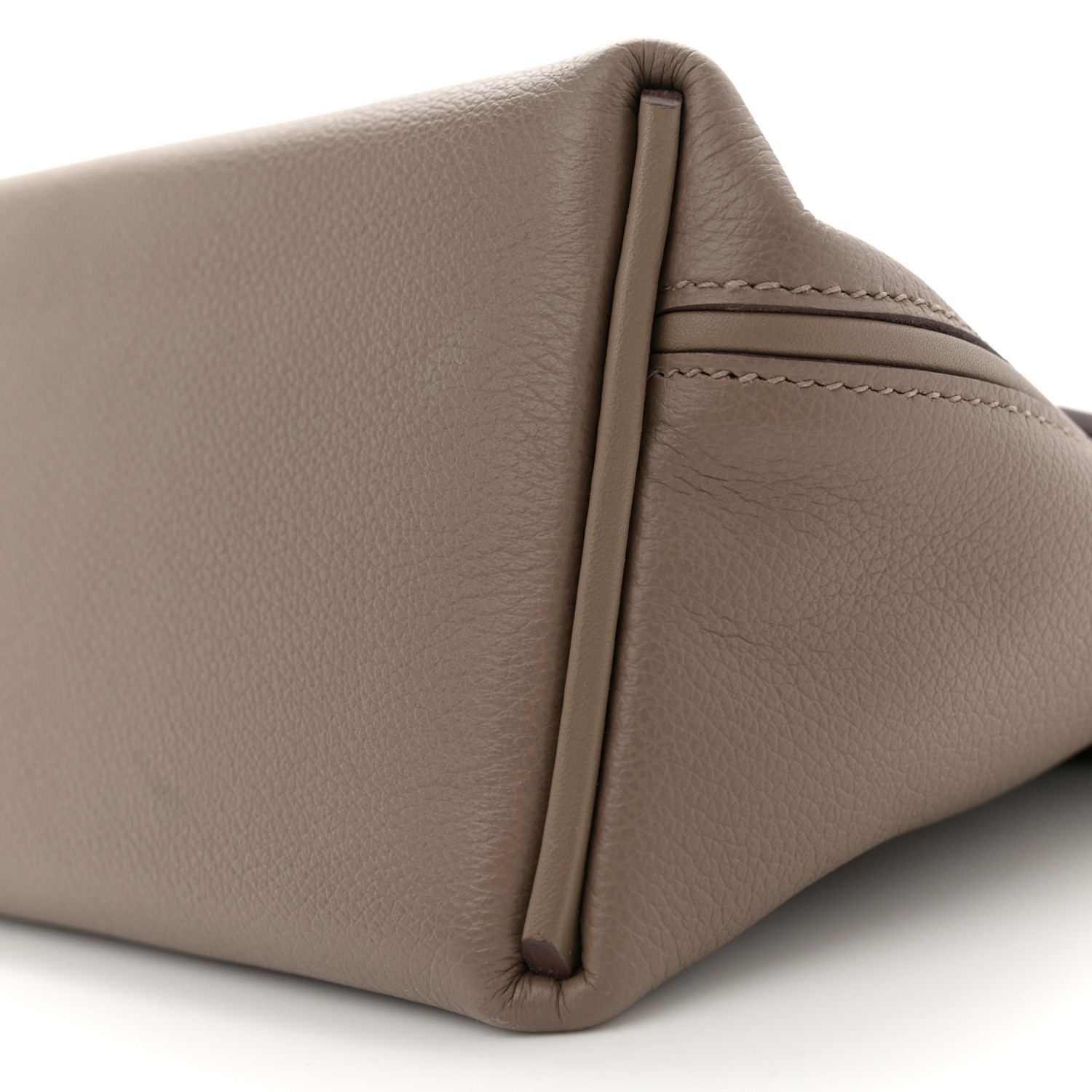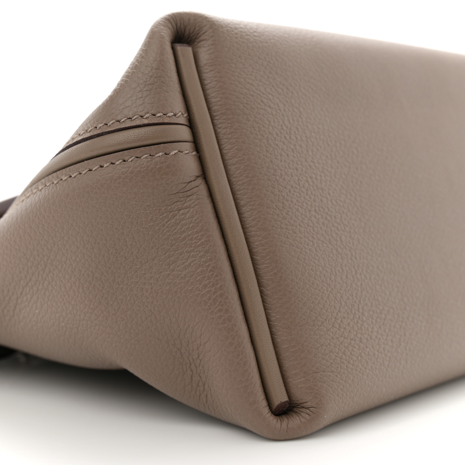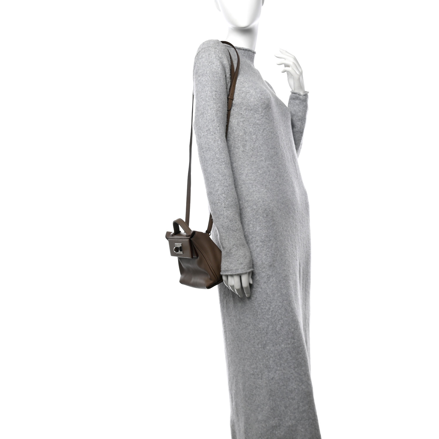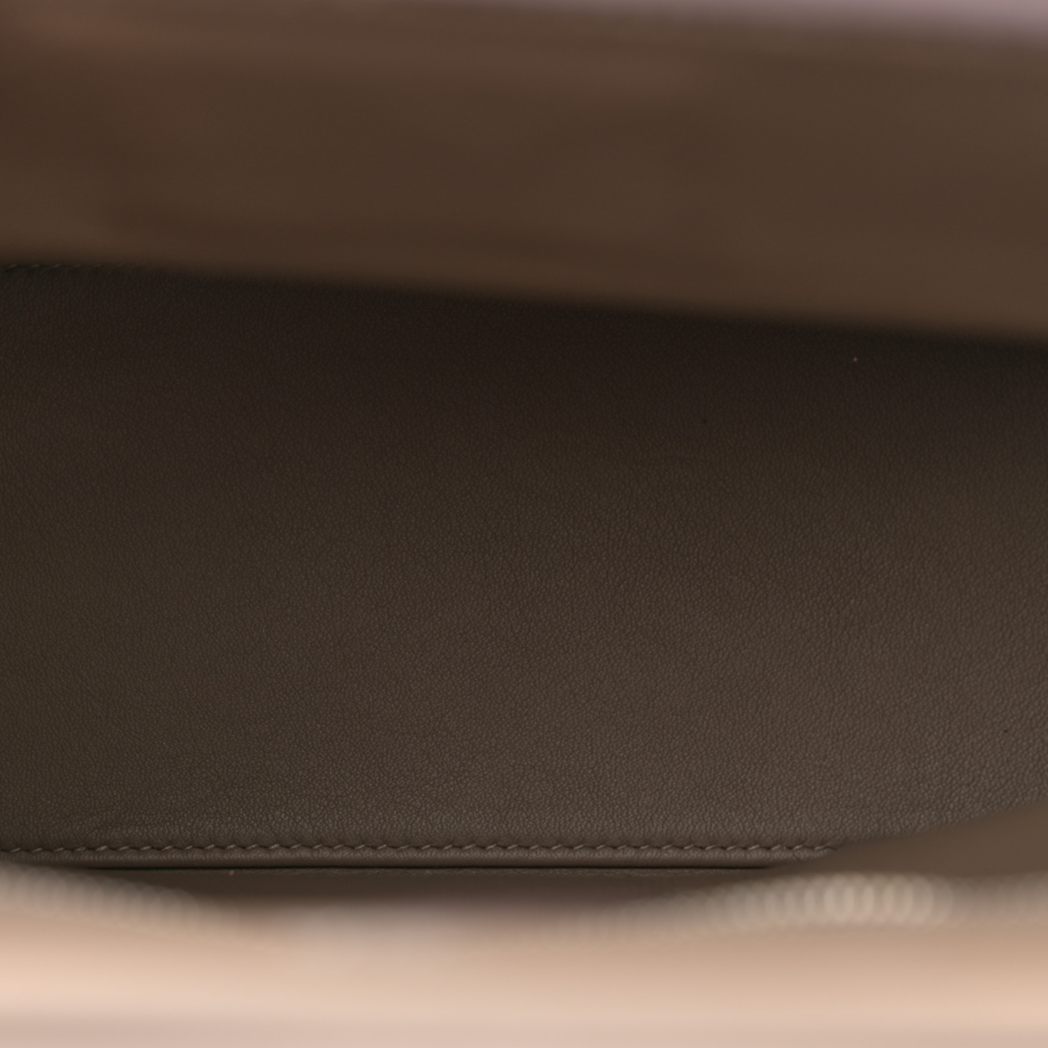 This is an authentic HERMES Evercolor Swift 24/24 21 in Etoupe. This handbag is crafted of richly textured evercolor and swift leather in beige. The bag features a reinforced leather top handle, an optional leather shoulder strap, and palladium hardware. This bag can also be styled as a belt bag. The flap opens to a matching smooth leather interior with a zipper pocket.