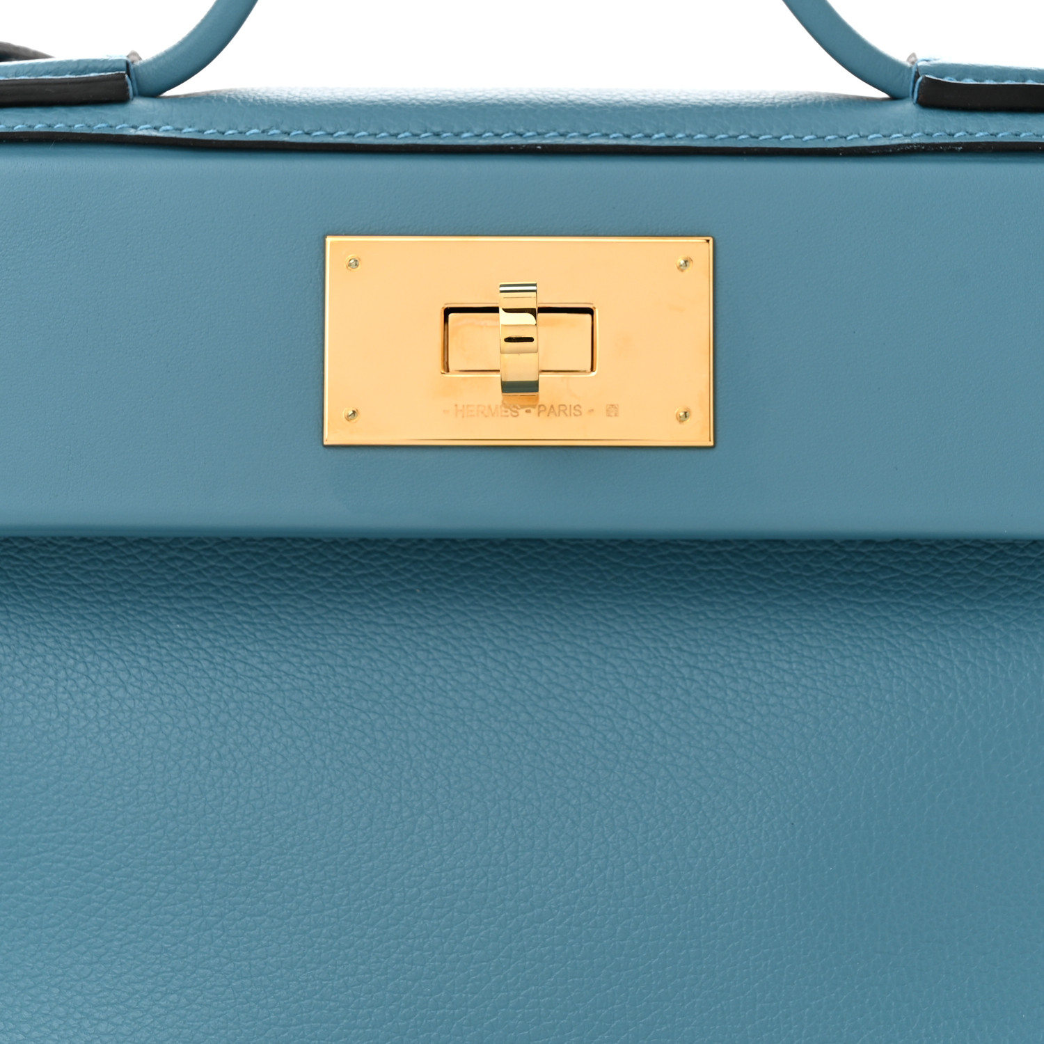This is an authentic HERMES Evercolor Swift 24/24 21 in New Blue Jean. This handbag is crafted of richly textured calfskin leather in light blue. The bag features a rear patch pocket, reinforced leather top handle, an optional leather shoulder strap, and gold plated hardware. This bag can also be styled as a belt bag. The flap opens to a matching smooth leather interior with a zipper pocket.