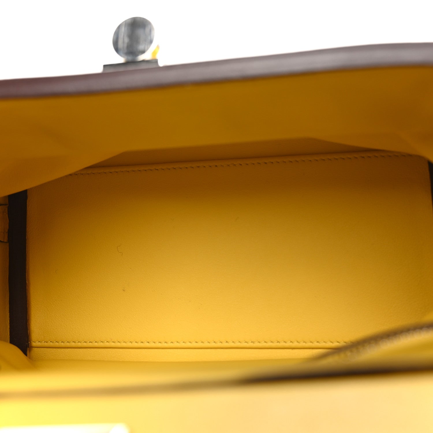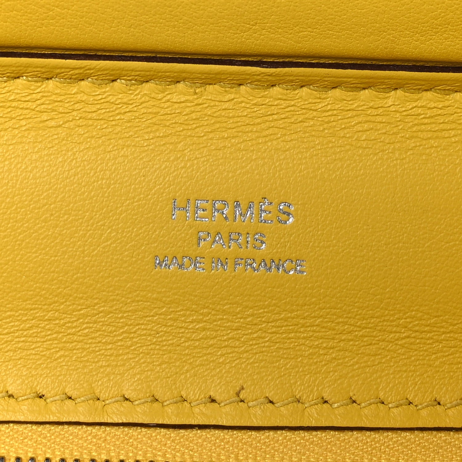 This is an authentic HERMES Evercolor Swift 24/24 in Jaune Citron. This handbag is crafted of richly textured calfskin leather in yellow. The bag features a reinforced leather top handle, an optional leather shoulder strap, and palladium hardware, including a turn lock. This bag can also be styled as a belt bag. The flap opens to a matching smooth leather interior with a zipper pocket.