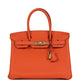 This Birkin is in Feu togo leather with gold hardware and has tonal stitching, front flap, two straps with center toggle closure, clochette with lock and two keys and double rolled handles.