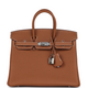 This Birkin is in Gold togo leather with palladium hardware and features contrast stitching, front flap, two straps with center toggle closure, a clochette with lock and two keys and double rolled handles.
