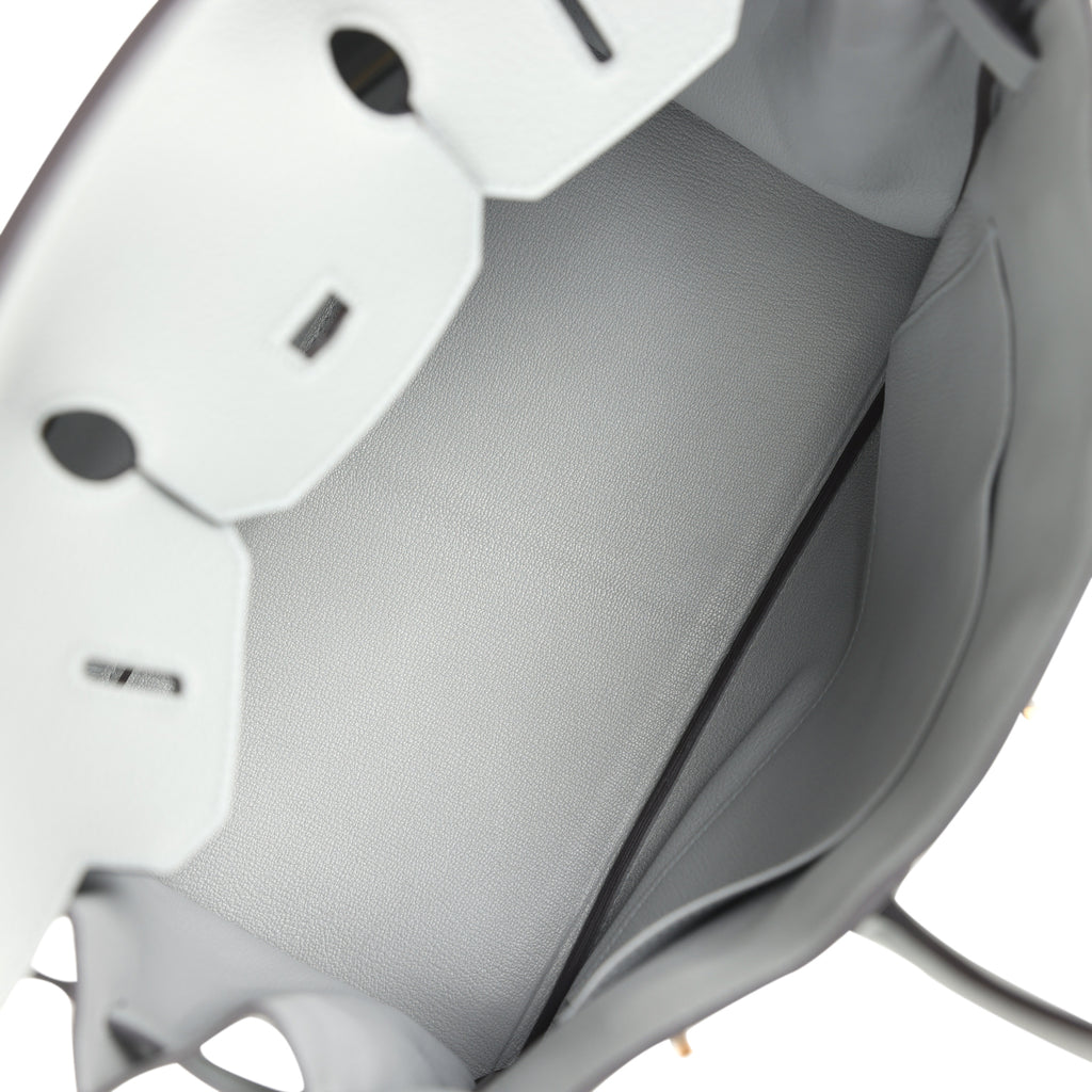 This Birkin is in Gris Mouette togo leather with gold hardware and has tonal stitching, front flap, two straps with center toggle closure, clochette with lock and two keys, and double rolled handles.