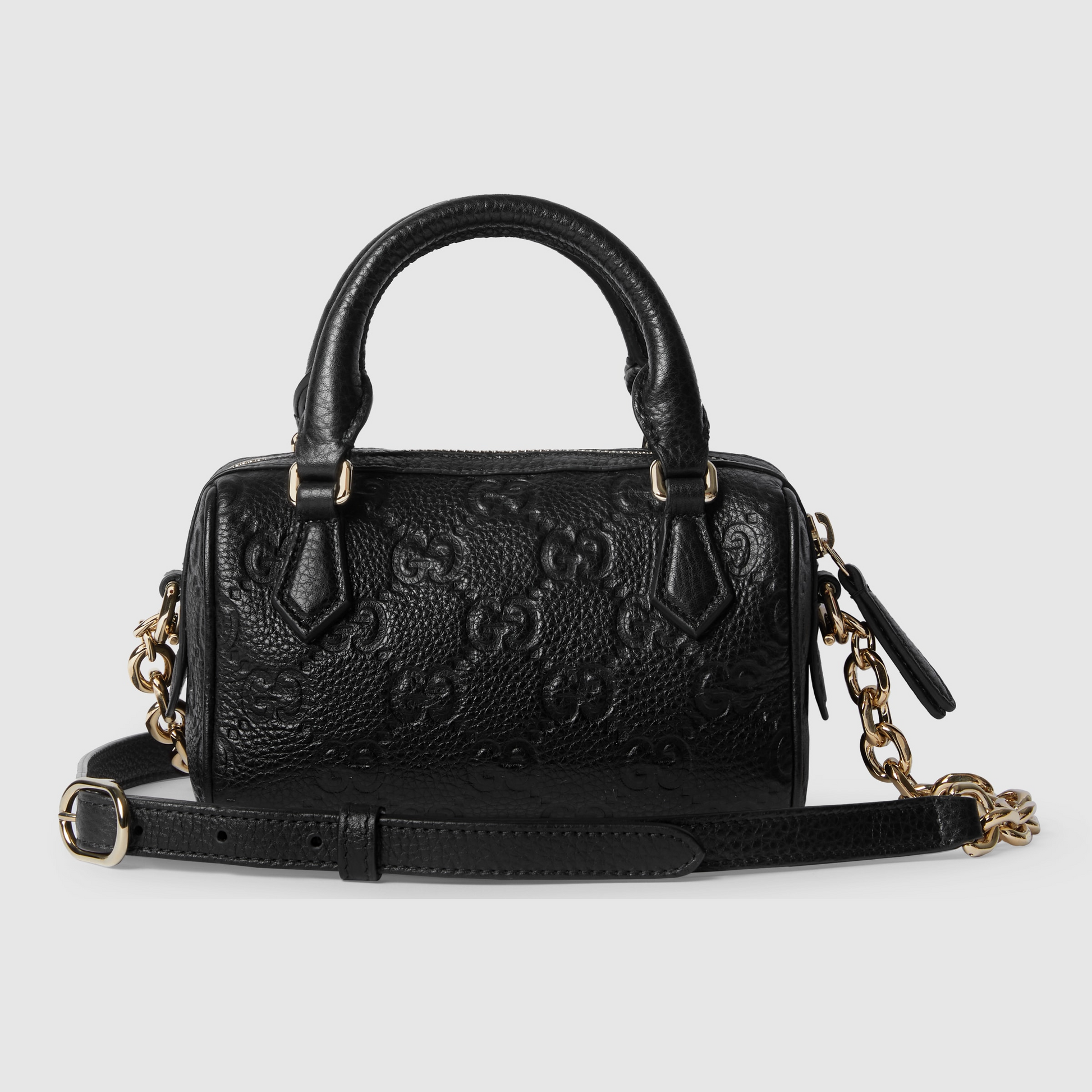 The GG Emblem collection reinterprets signature motifs through creativity and innovative functions , and is envisioned to be cherished for years to come. Introduced in the latest line of small accessories, this top handle bag is crafted from emblematic GG grainy leather. The design comes with an adjustable chain and leather shoulder strap and a secure zip closure.