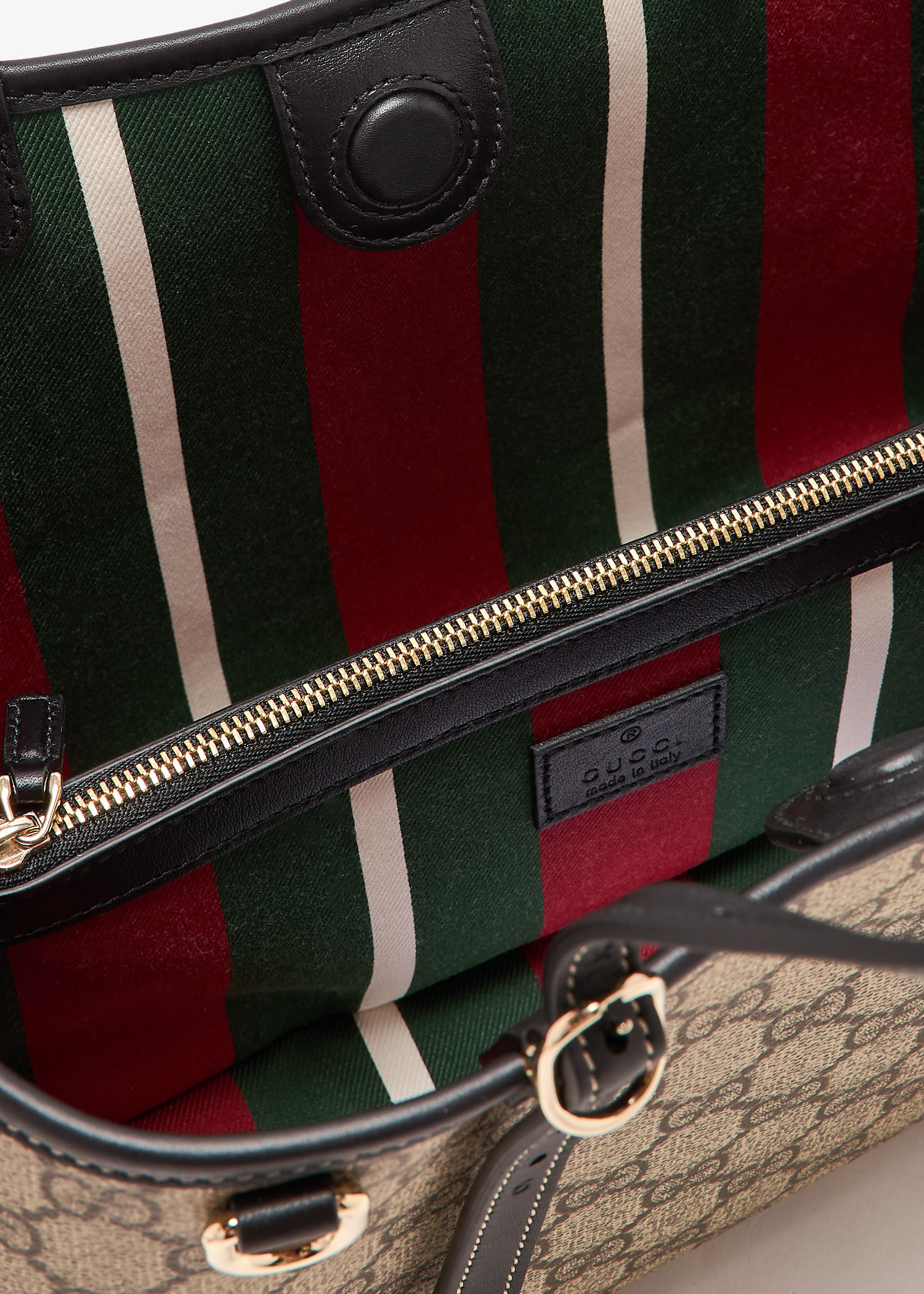 Gucci's GG Emblem collection reinterprets the House’s history of elegance and craftsmanship. This small tote bag offers a cool, slouchy silhouette for an effortless look, crafted in beige and dark brown new GG Monogram coated fabric with black leather trim, one internal zip pocket, and a D-ring for detachable items like bag charms and small accessories. Carry by the adjustable shoulder straps or the removable long leather strap for bespoke carry.