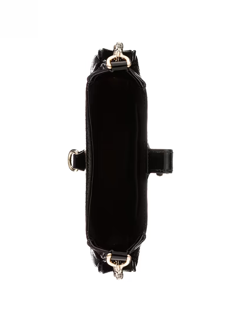Mini bag made of patent leather. Chain shoulder strap at the top, flap strap with a clasp closure, one main compartment, and a card slot with an embossed brand logo inside.