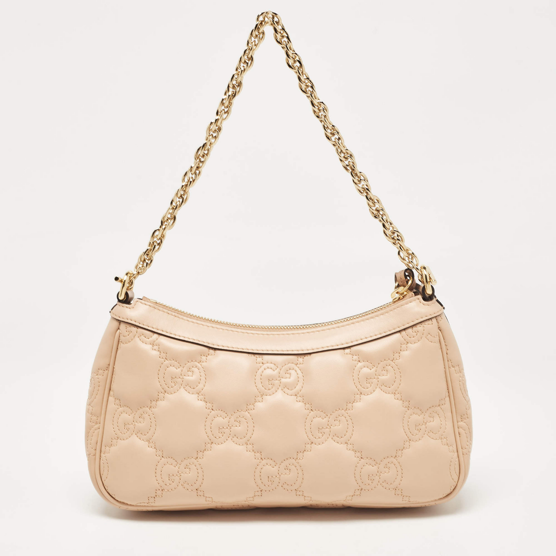Blending pink and beige, neutrals set the tone across a selection of handbags and accessories, putting the emphasis on textures, materials, and functionality. Here, it enriches this handbag and is further enhanced with a gold-toned Double G emblem.