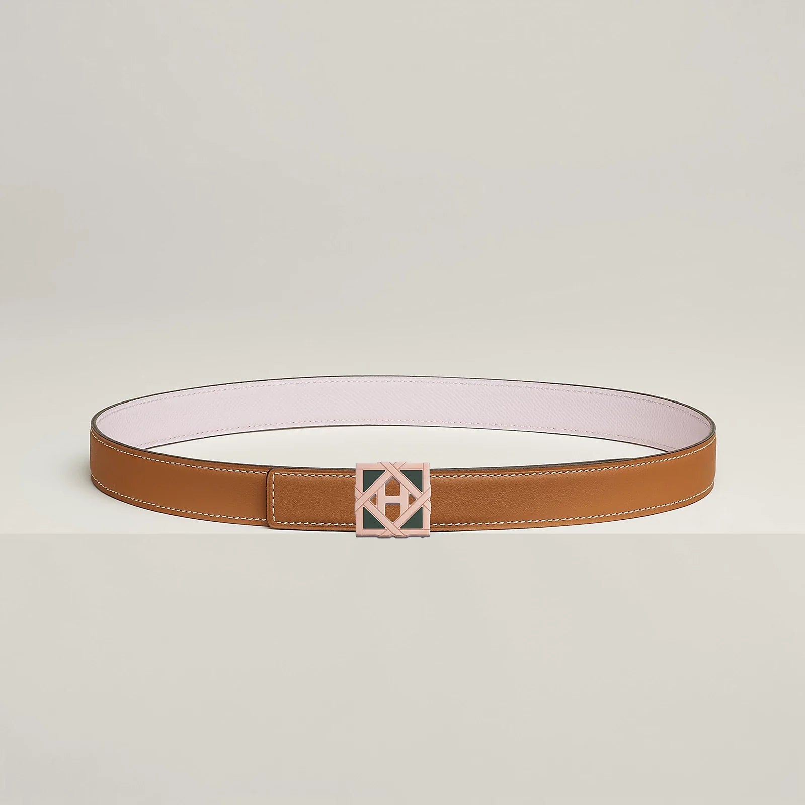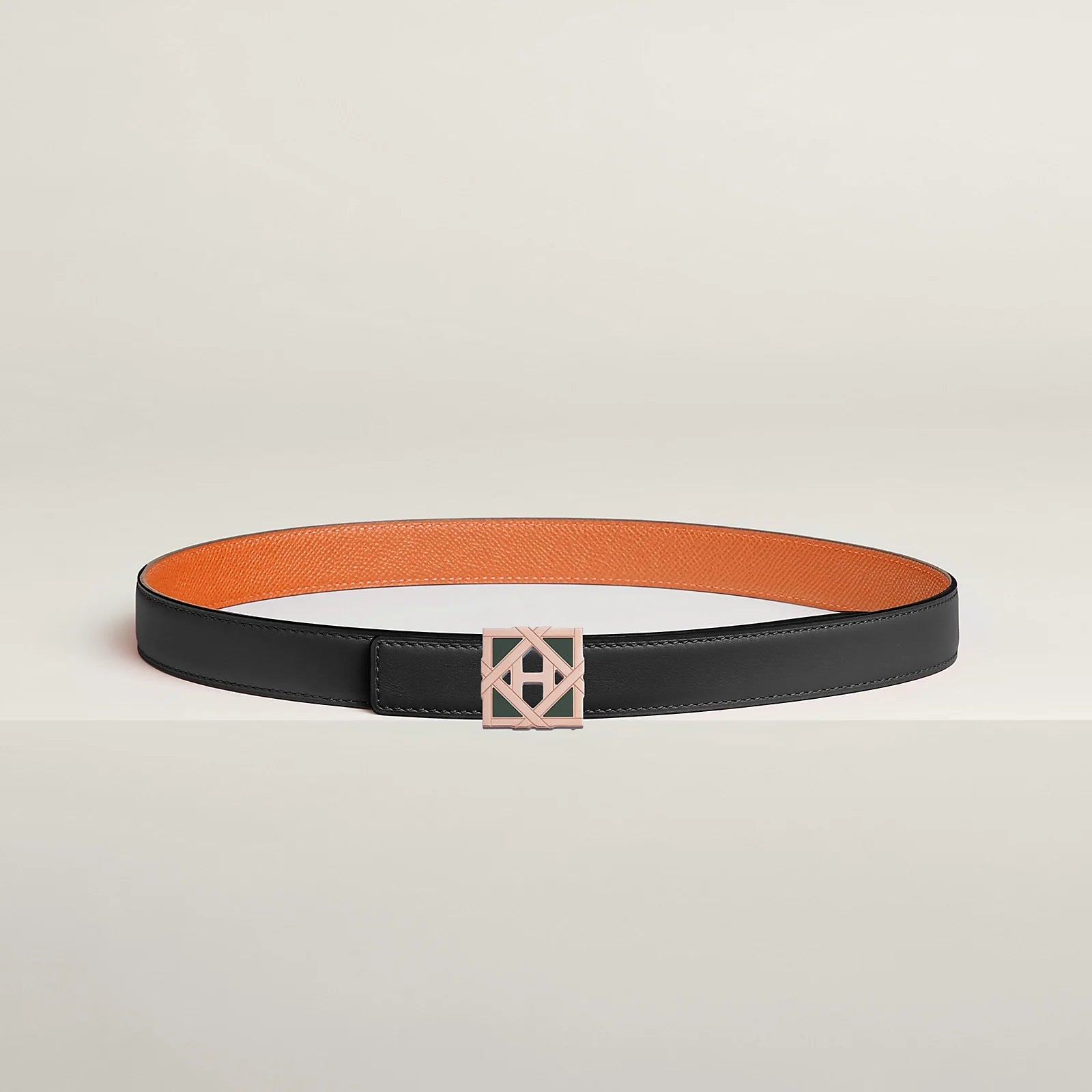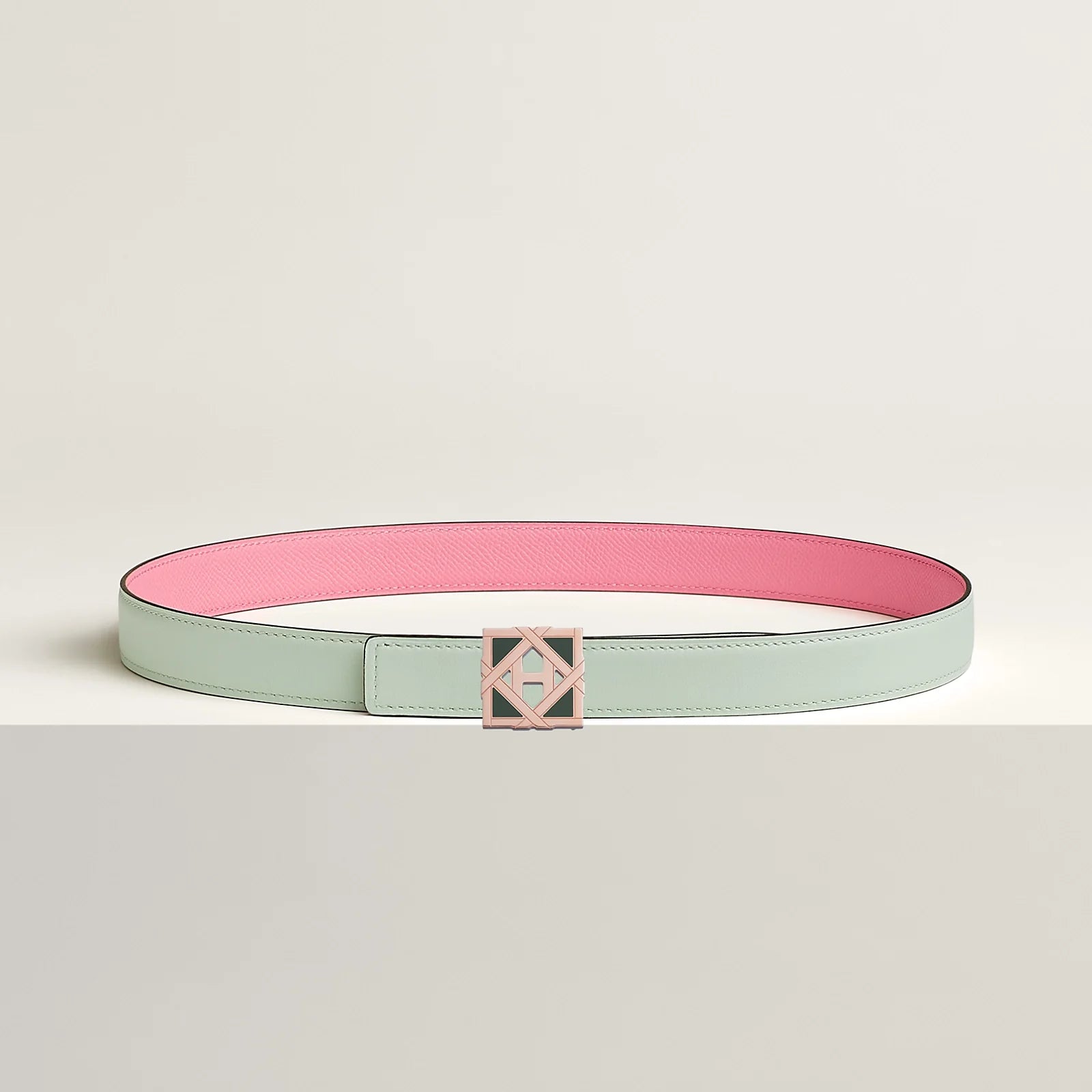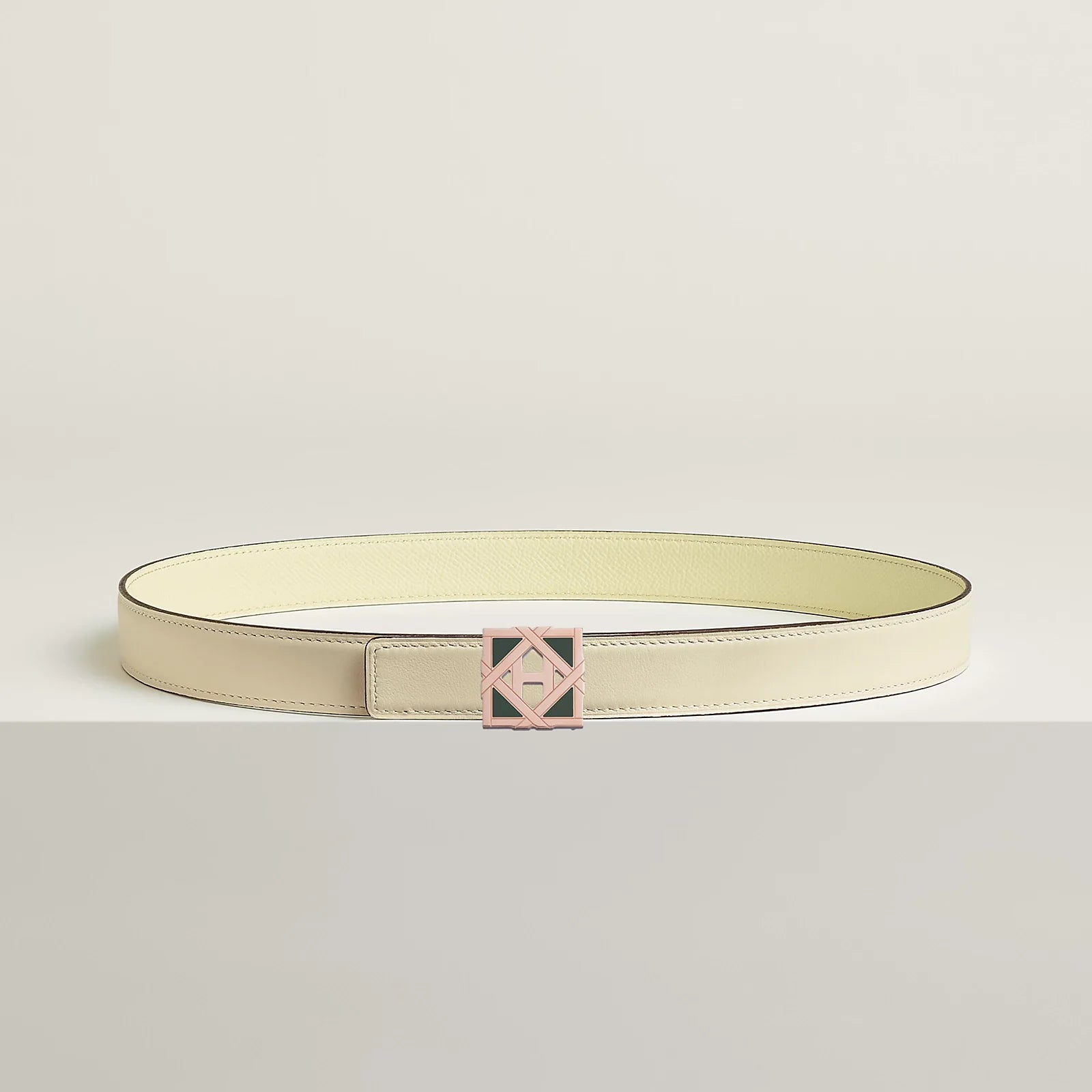 This buckle is a nod to the 24, rue du Faubourg Saint-Honore store's rooftop garden. It features geometric shapes reminiscent of the canework lattice, and is adorned with opaque lacquer details that add novelty and femininity, while revealing a subtle "H" in the center.
