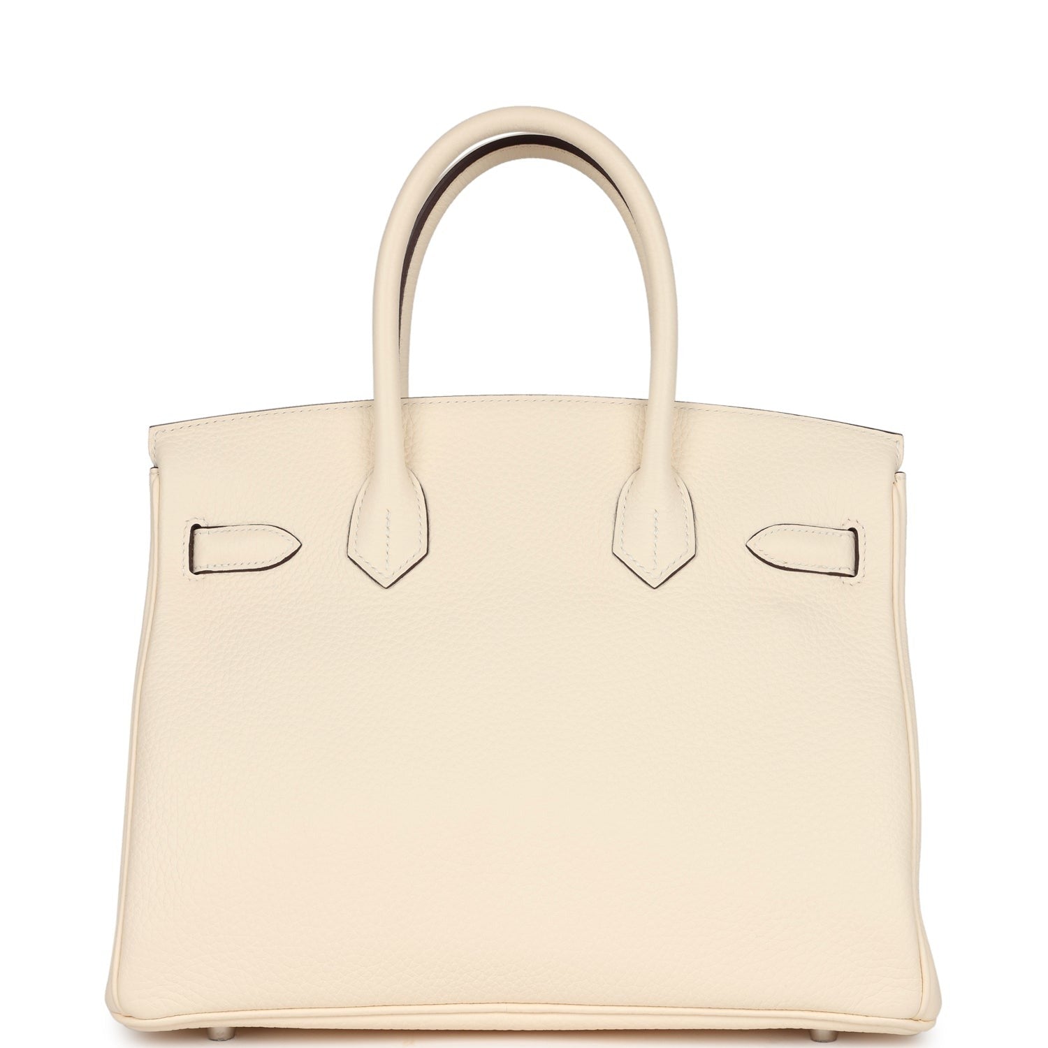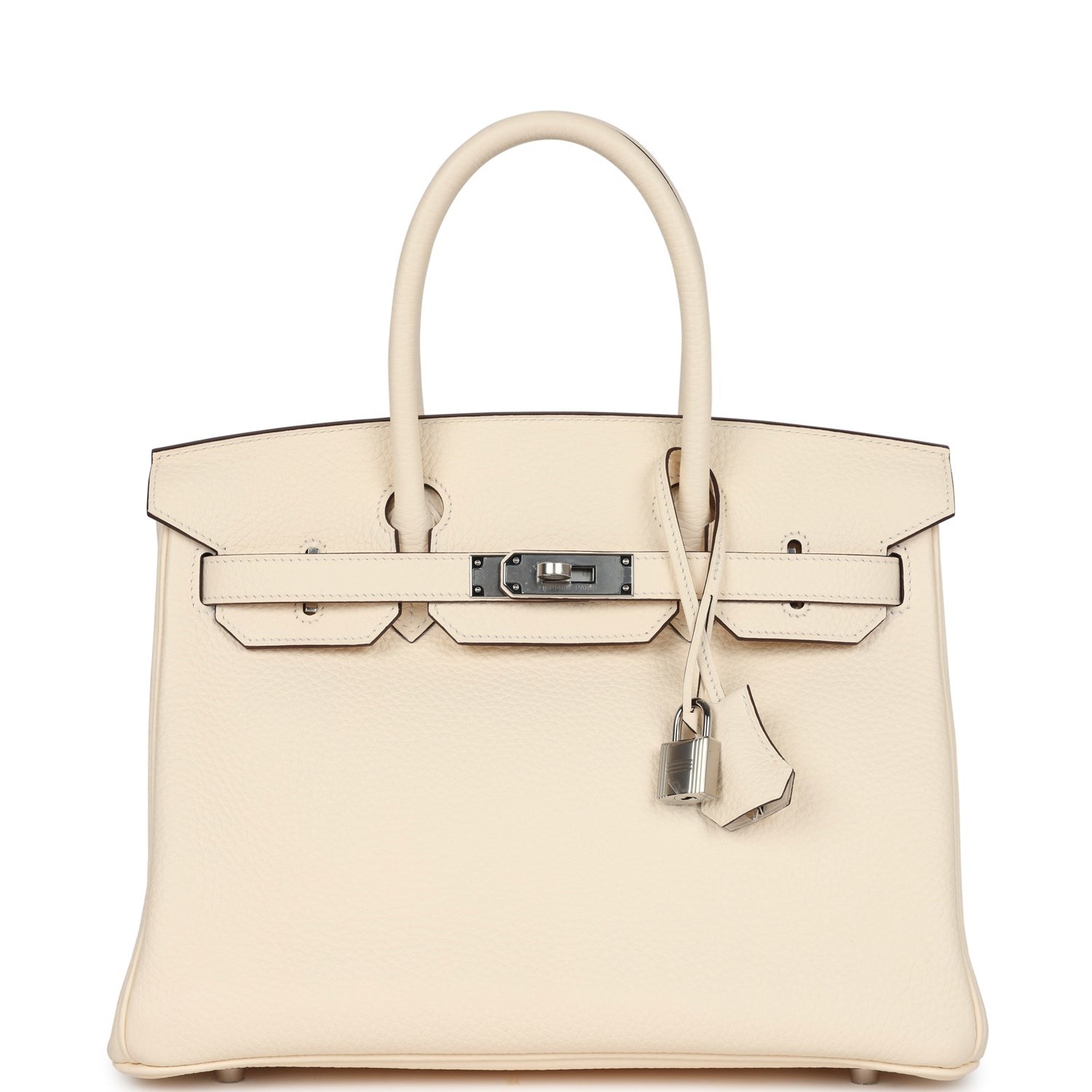 This Birkin is in Nata clemence leather with palladium hardware and has tonal stitching, front flap, two straps with center toggle closure, clochette with lock and two keys, and double rolled handles.