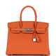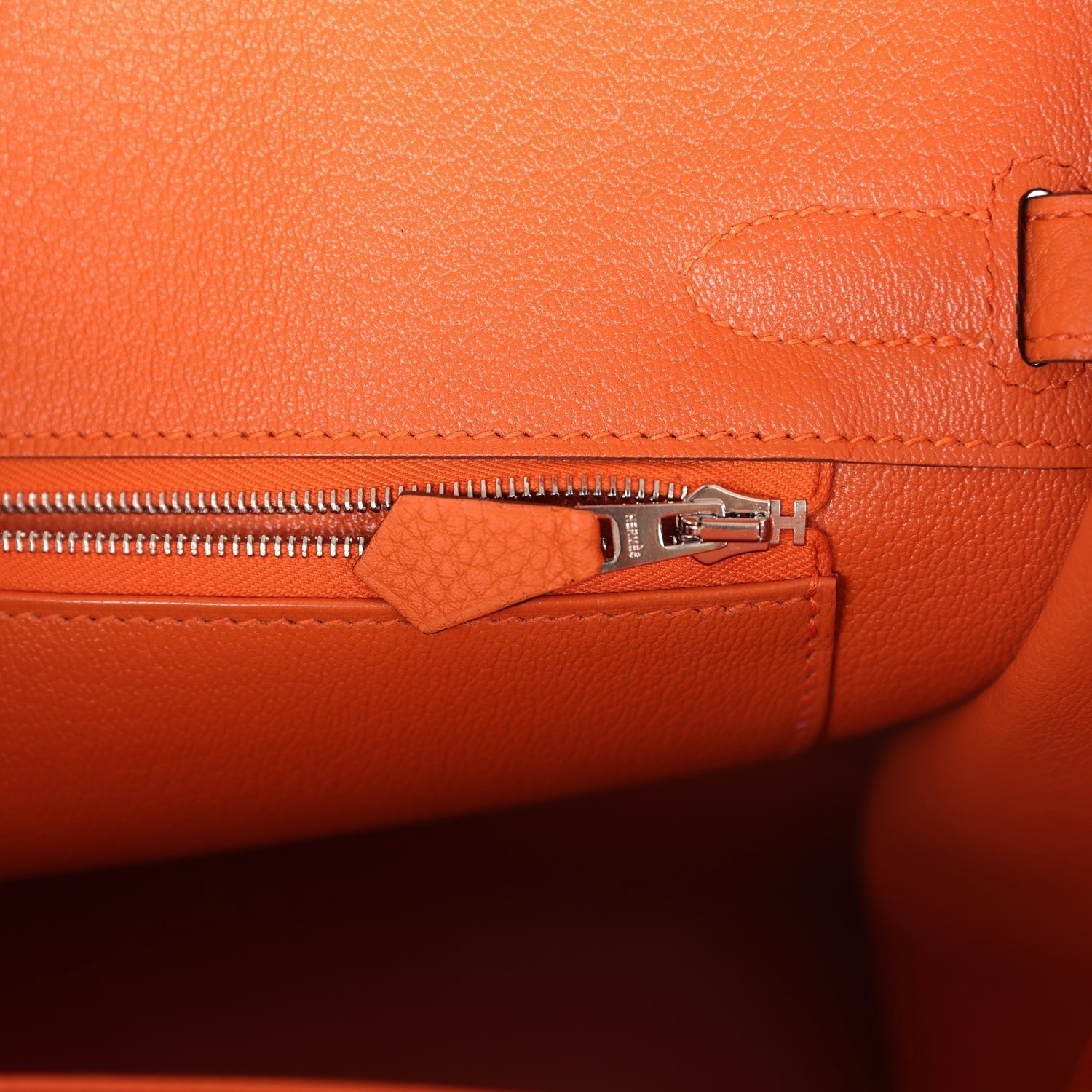 This Birkin is in Orange togo leather with palladium hardware, has tonal stitching, front flap, two straps with center toggle closure, clochette with lock and two keys, and double rolled handles.
