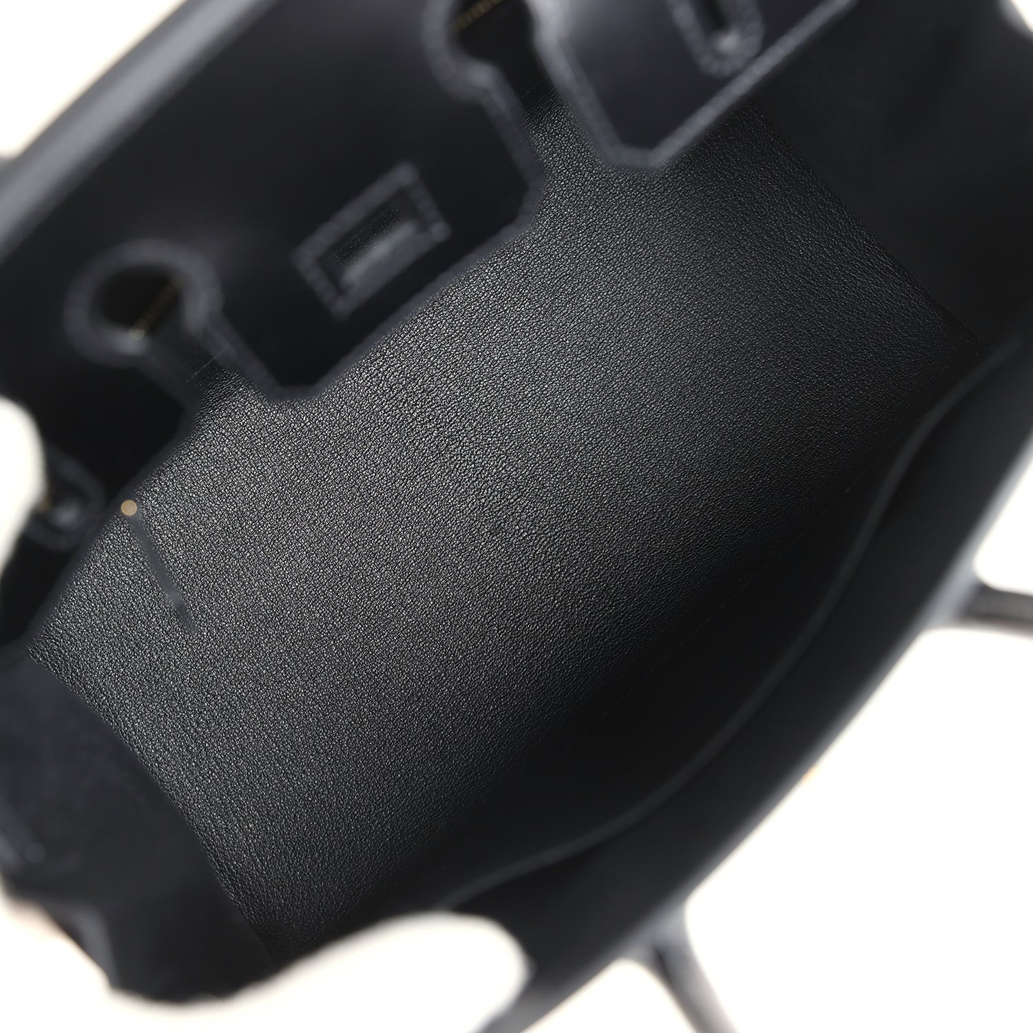 This Birkin is in Black box calfskin leather with gold hardware, featuring tonal stitching, front flap with two straps, front toggle closure, clochette with lock and two keys, and double rolled handles.
