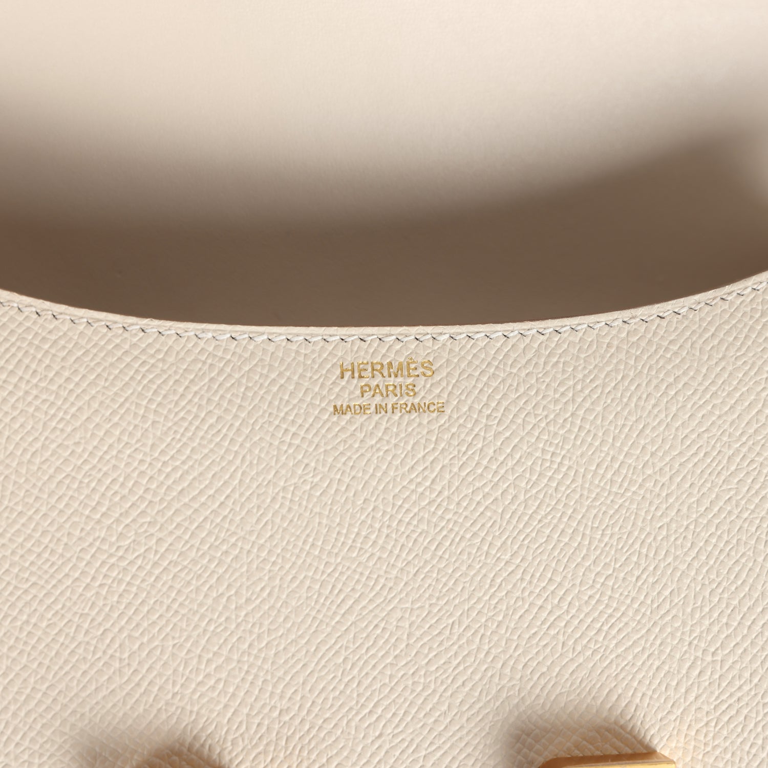 This Constance is in Craie epsom leather with brushed gold hardware and has tonal stitching, a metal "H" snap lock closure and adjustable shoulder strap.