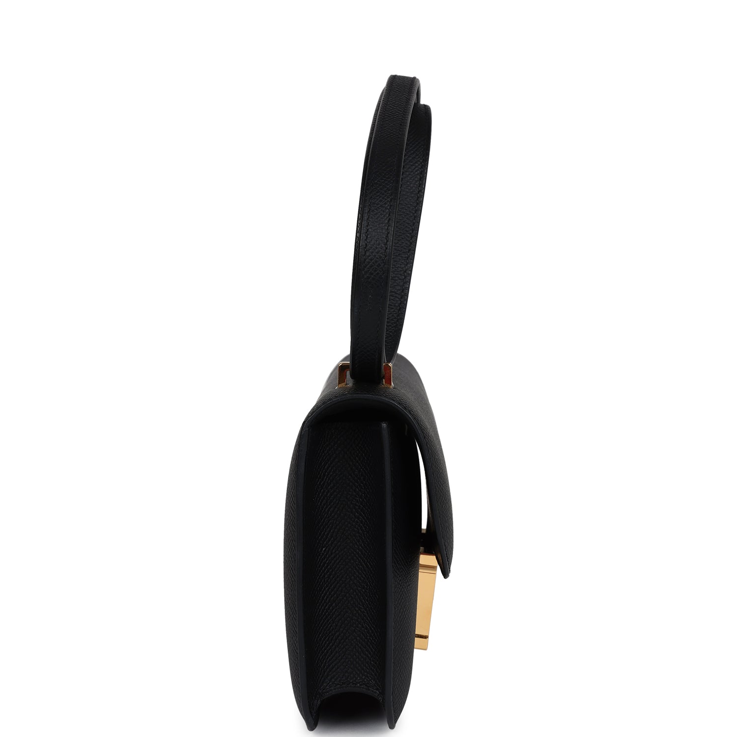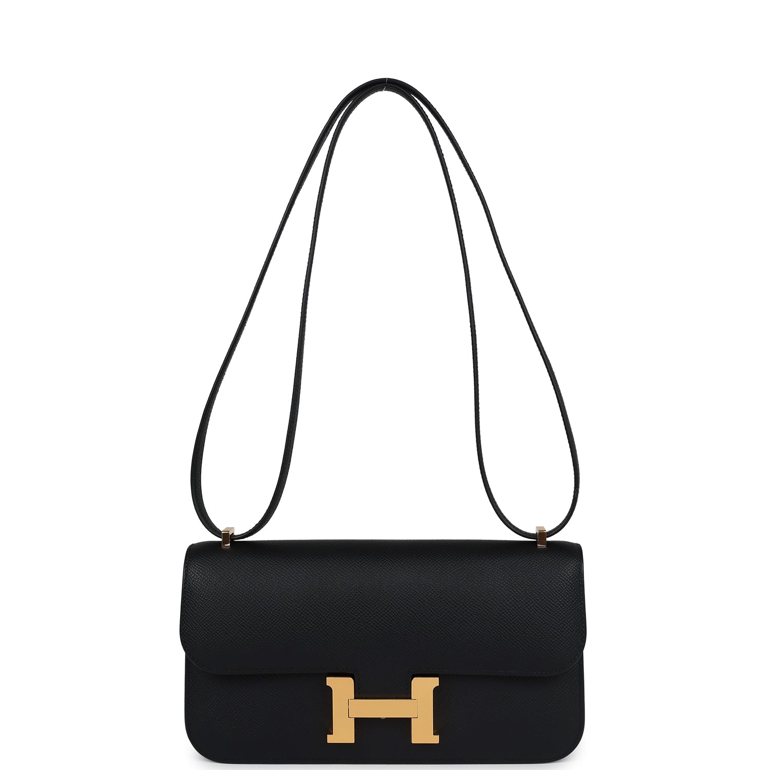 This Constance Elan is in Black epsom leather with gold hardware, featuring tonal stitching, metal "H" snap closure, and an adjustable strap.