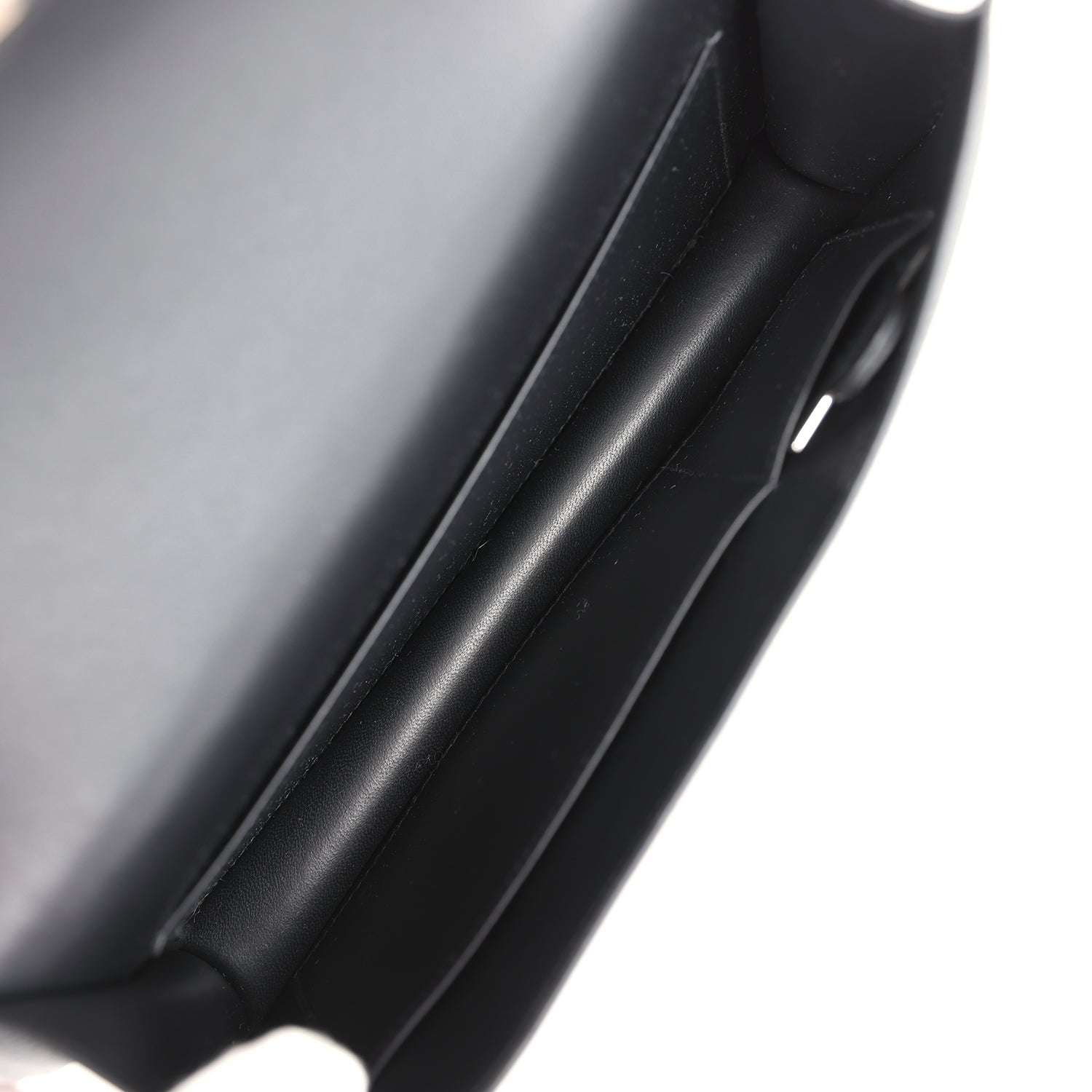 The interior is lined in Black lambskin leather and has two open pockets on the front wall, a removable mirror, and a slit pocket on the back wall.