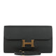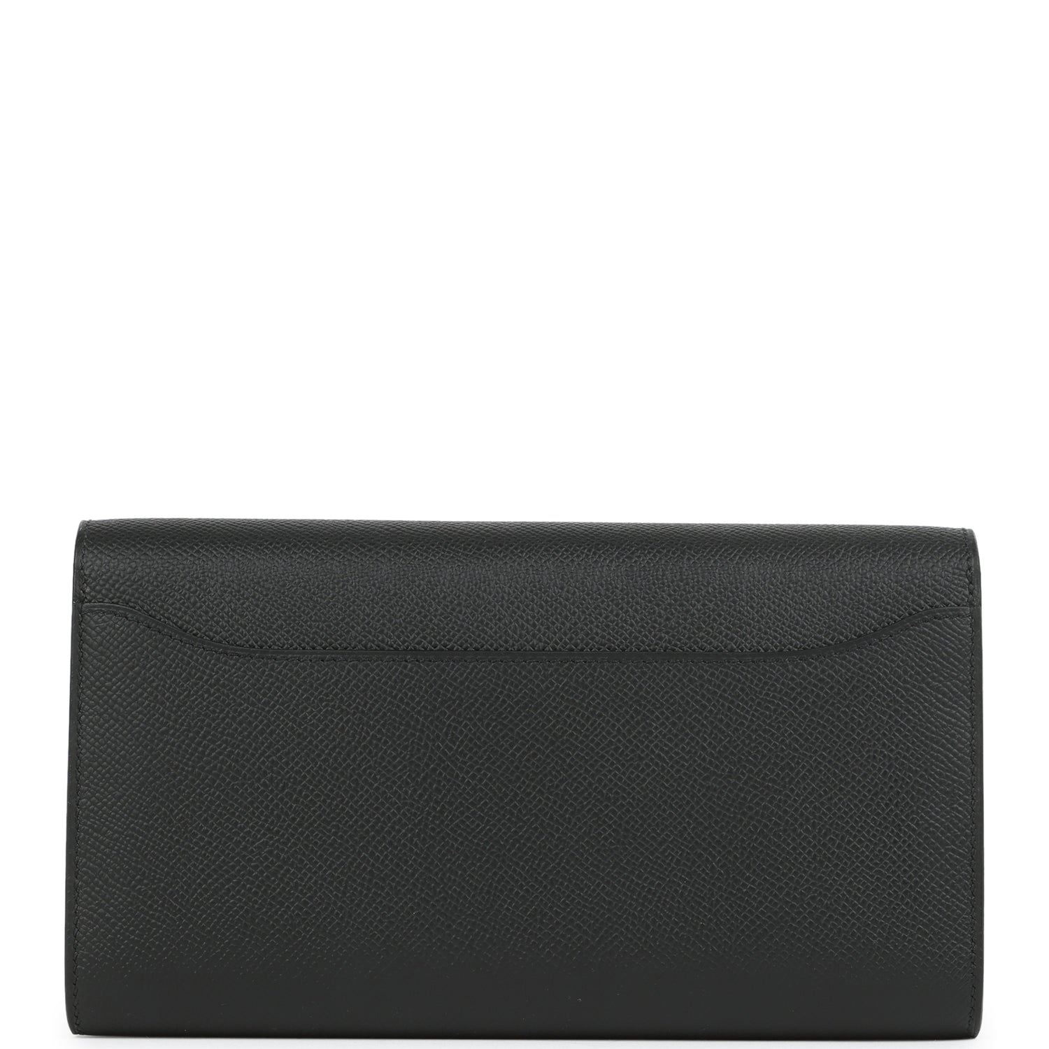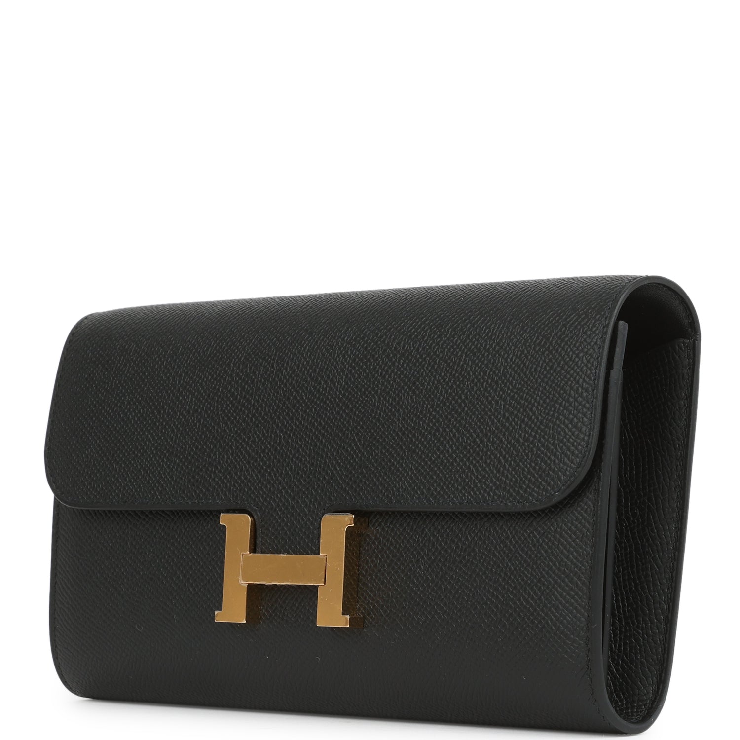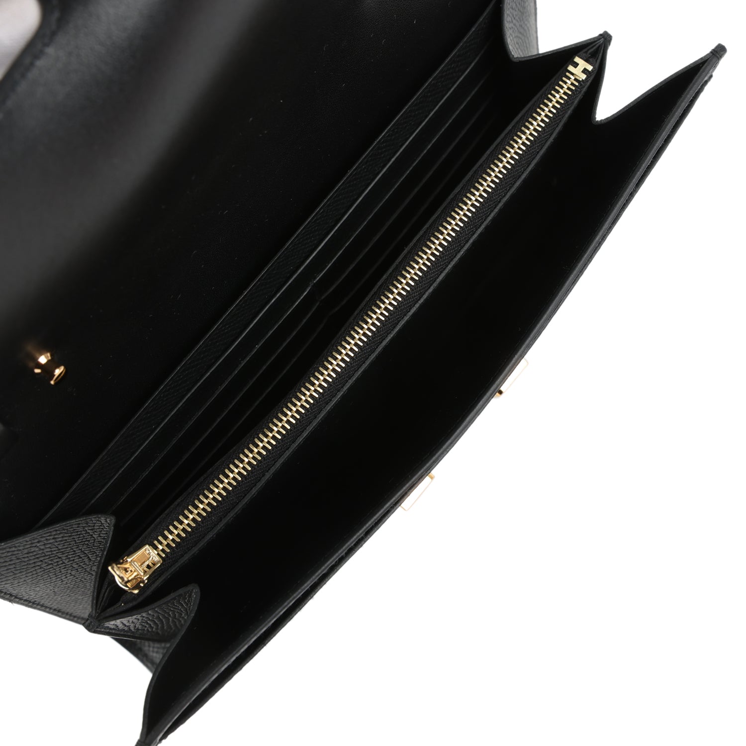 This Constance Wallet To Go is in Black epsom leather with gold hardware and has tonal stitching, metal "H" snap lock closure, open front compartment and removable crossbody strap.