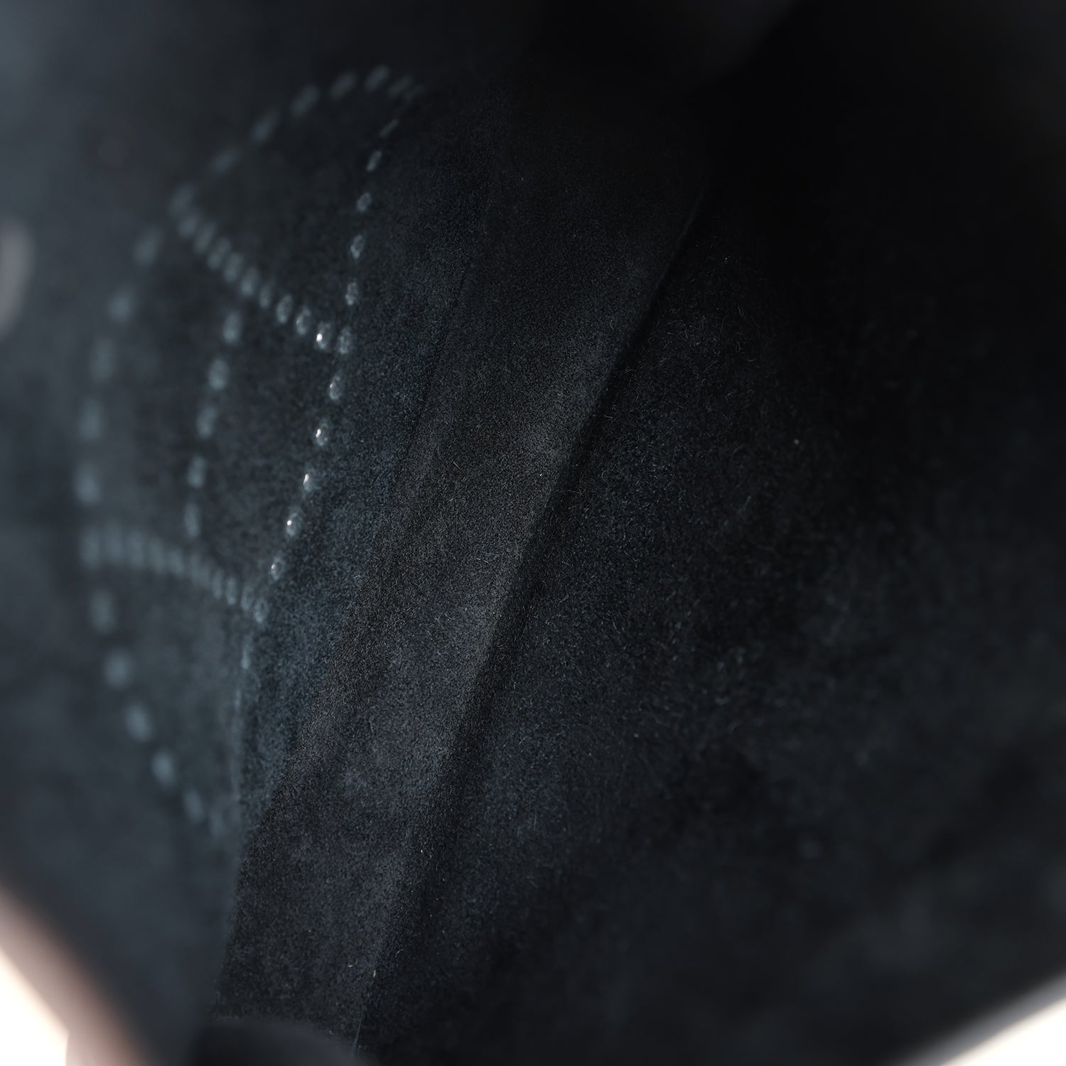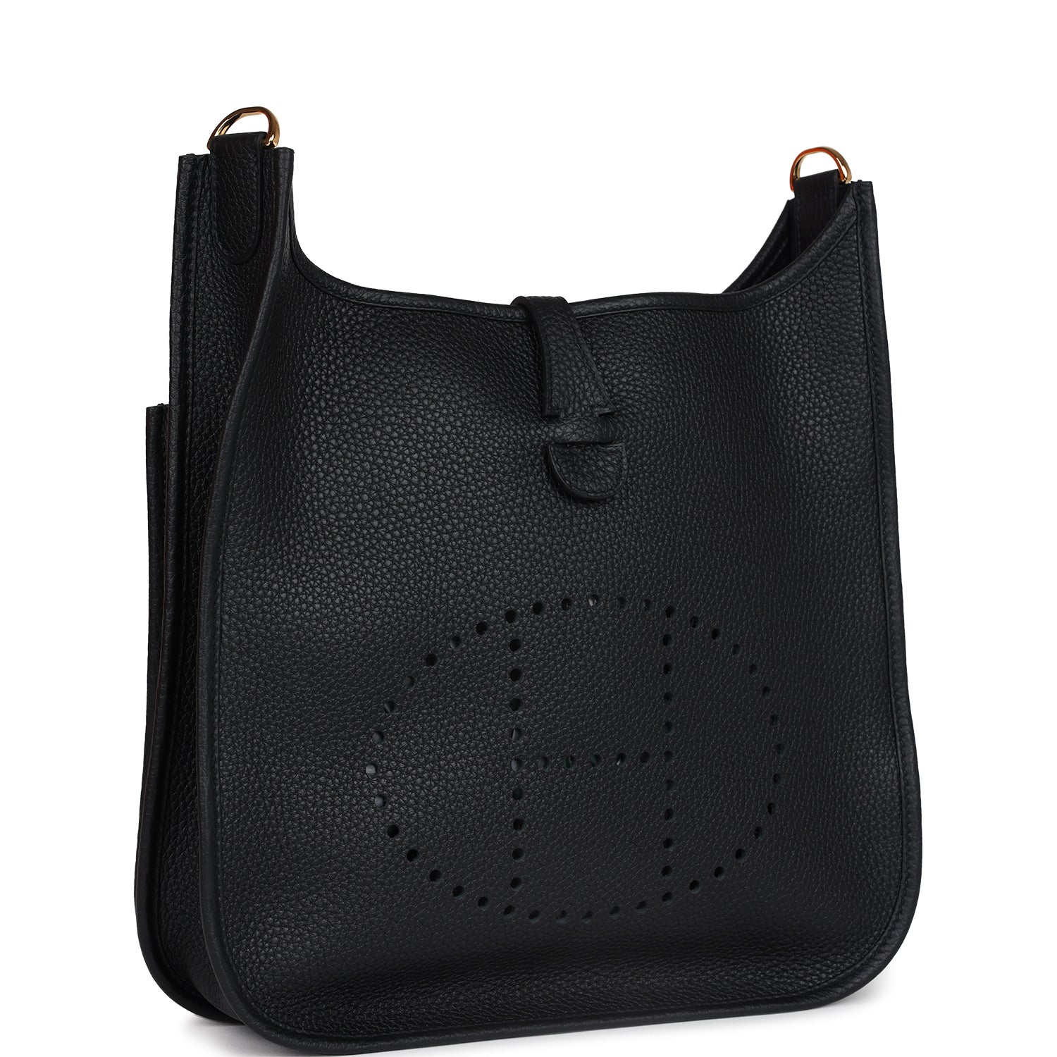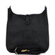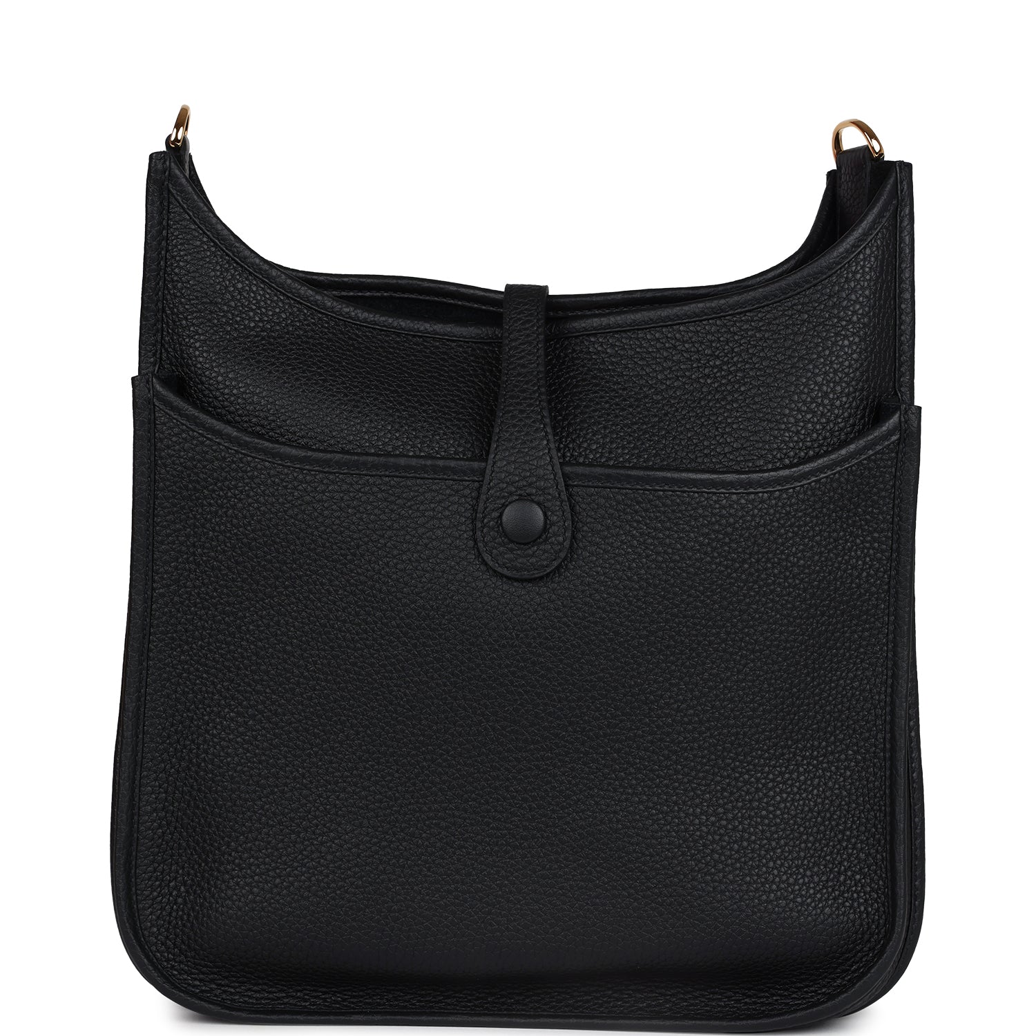 This Evelyne is in Black clemence leather with gold hardware and has tonal stitching, pull tab top closure and Black removable canvas and leather shoulder/crossbody strap.