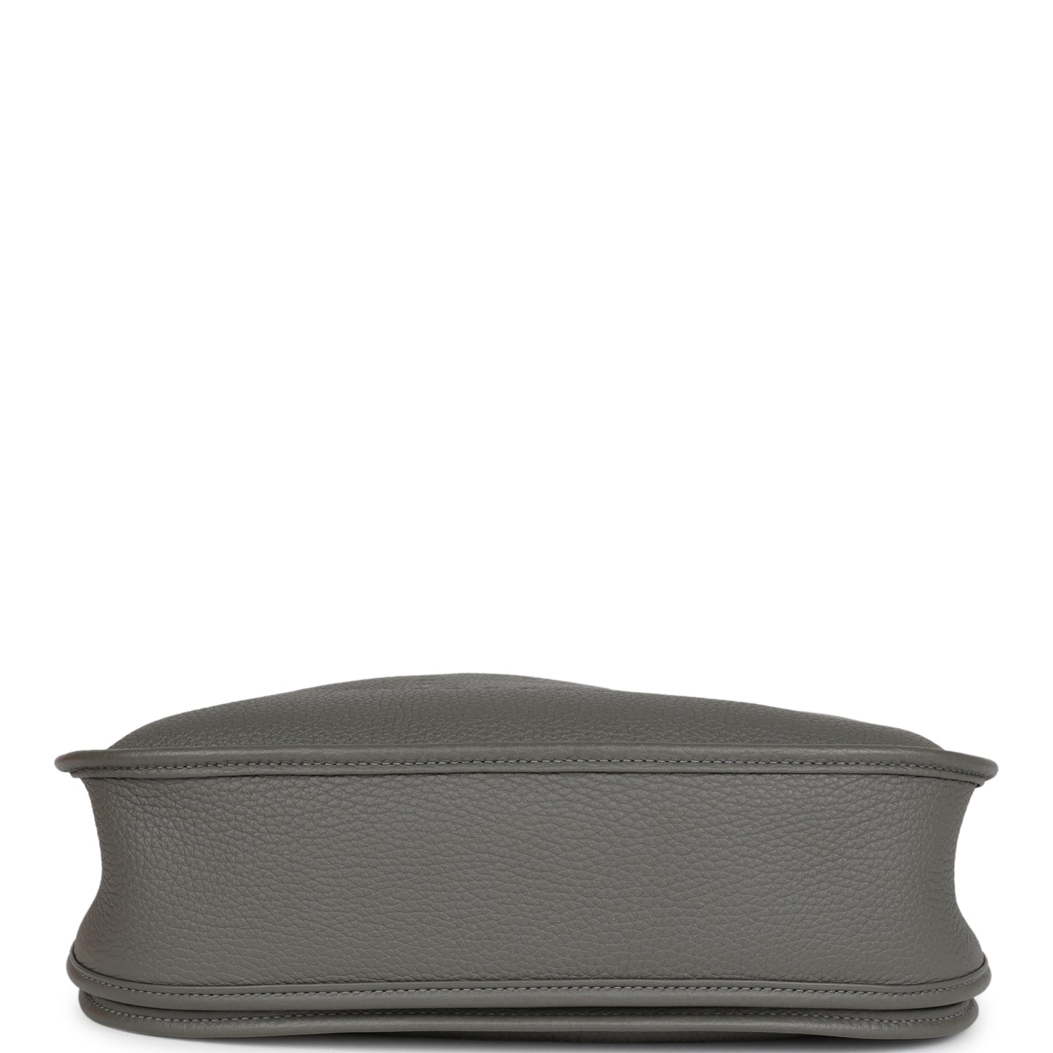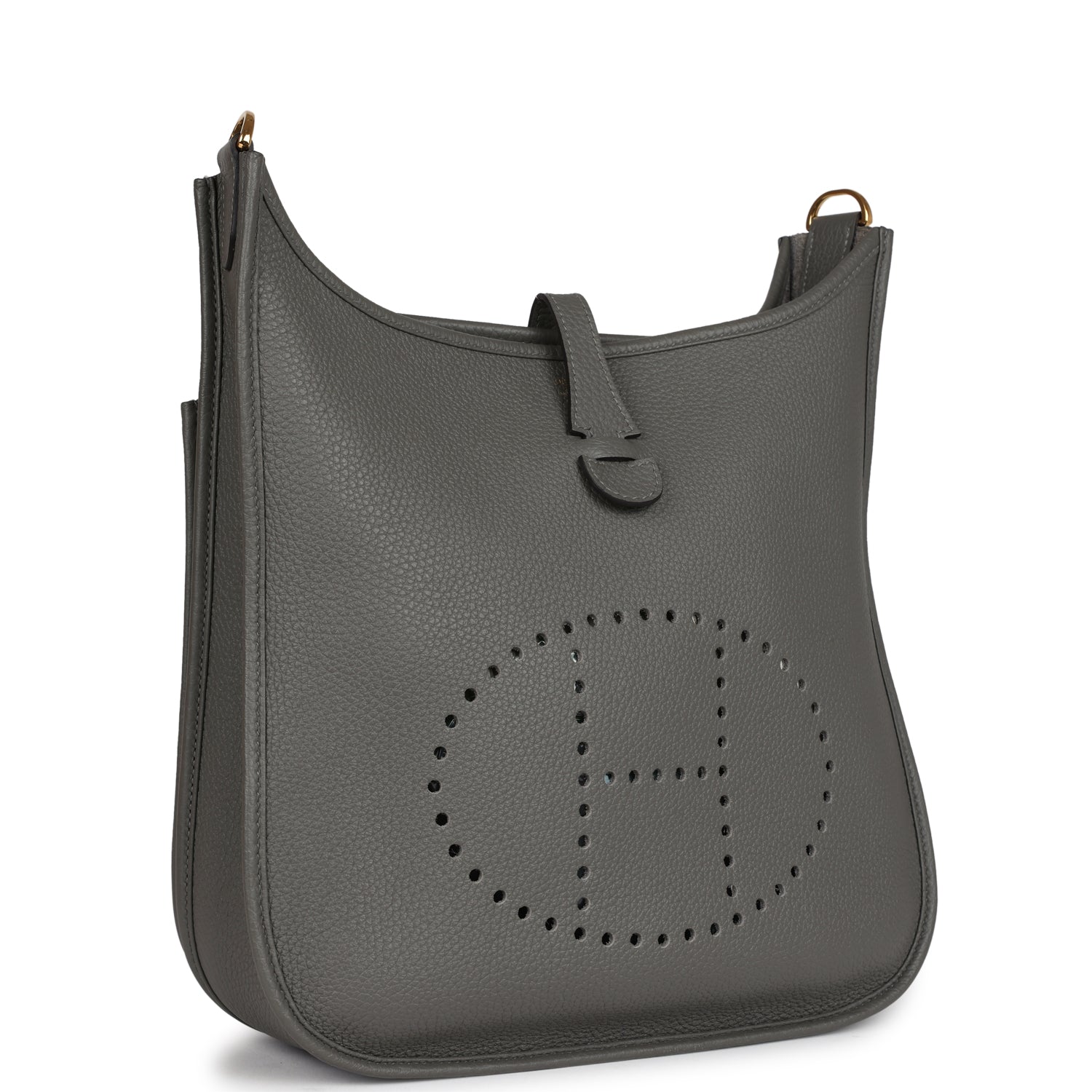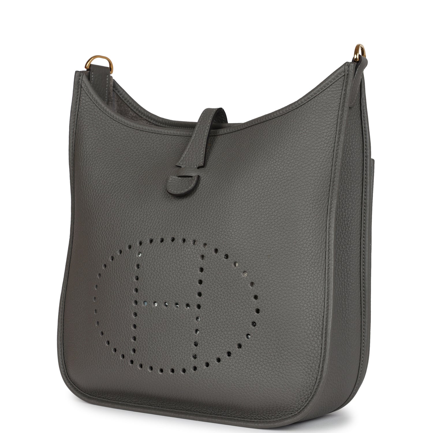 This Evelyne is in Gris Meyer clemence leather with gold hardware and has tonal stitching, pull tab top closure and Gris Meyer removable canvas and leather shoulder/crossbody strap.
