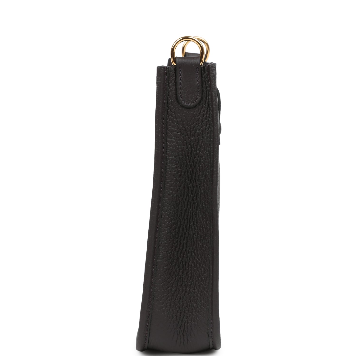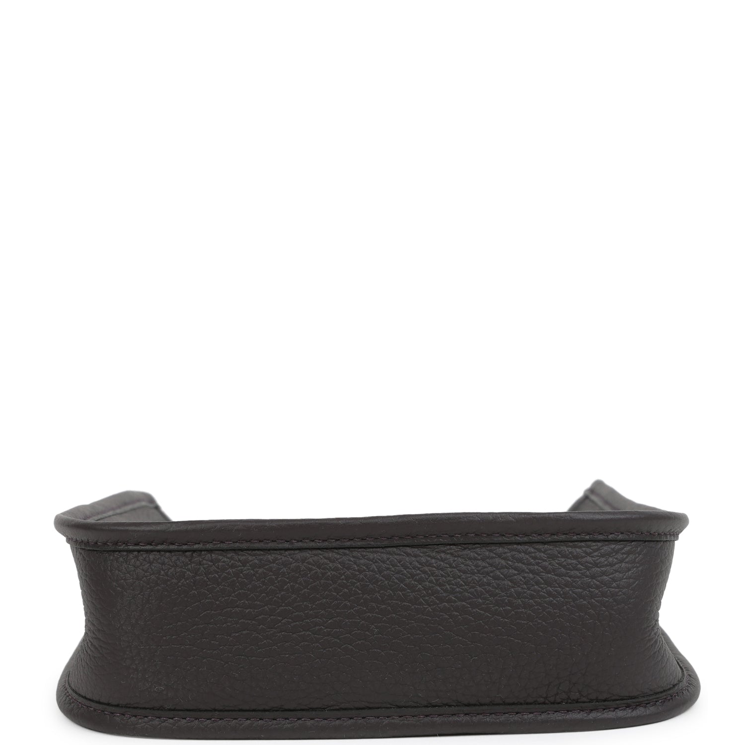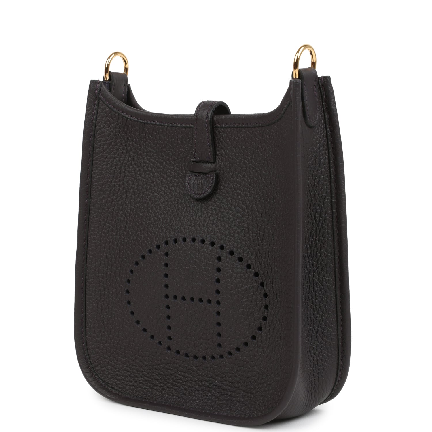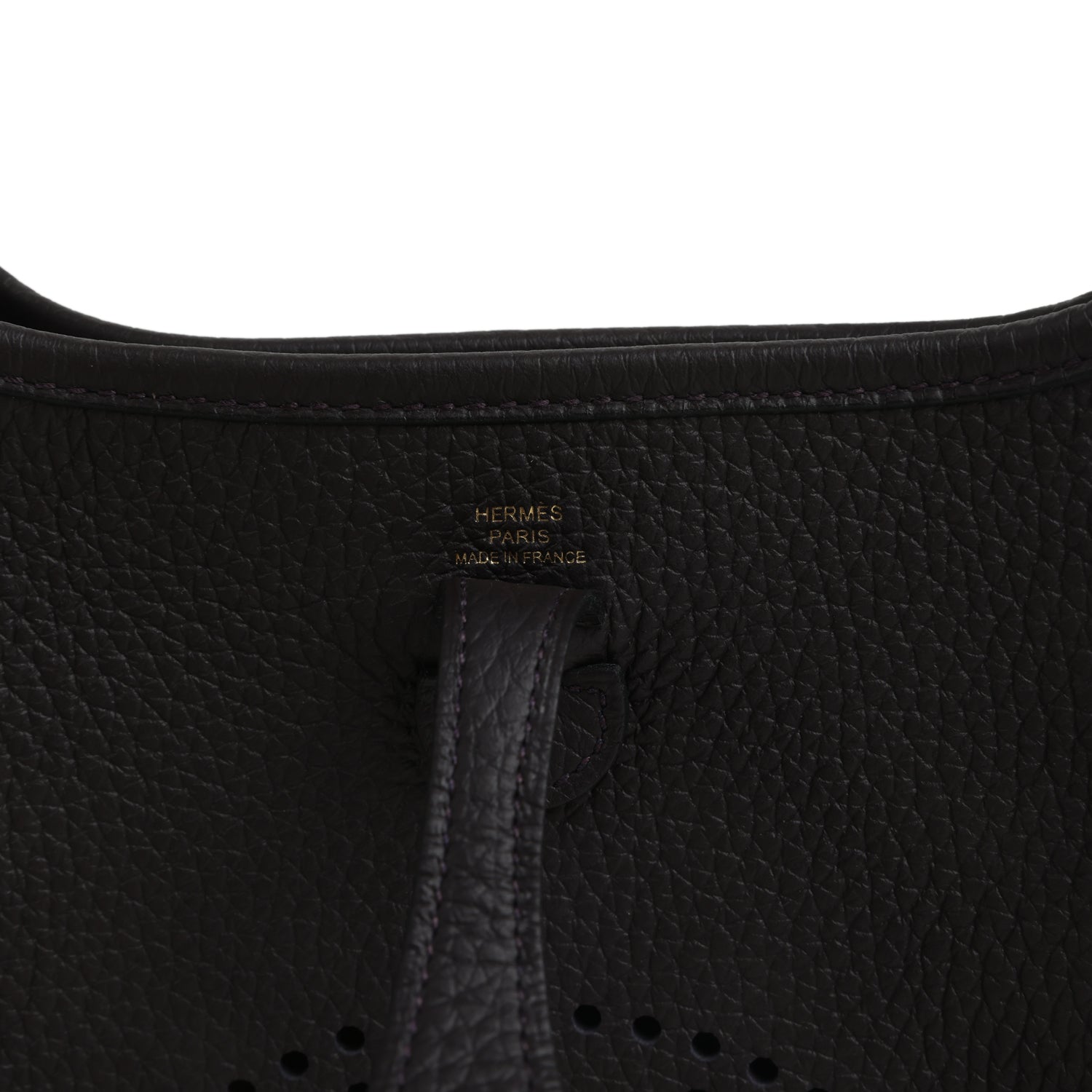 This Evelyne TPM Prunoir clemence leather messenger bag with tonal stitching with gold hardware, large perforated H in circle (front), pull tab top snap closure and removable Prunoir canvas and leather shoulder/crossbody strap.