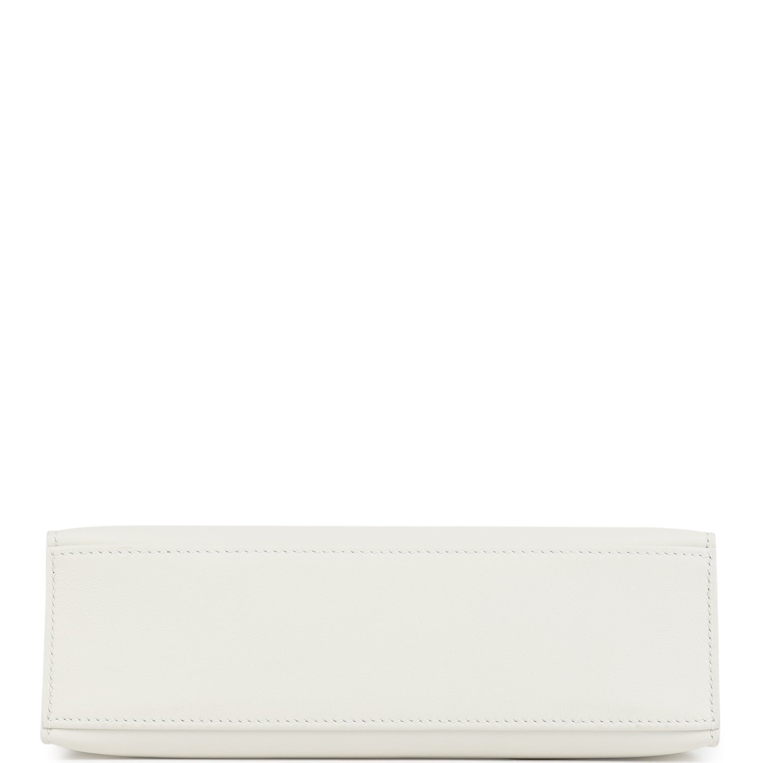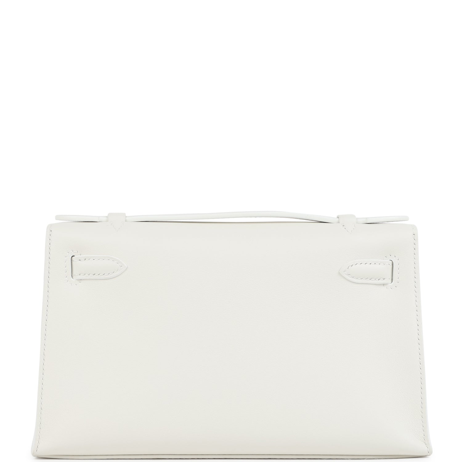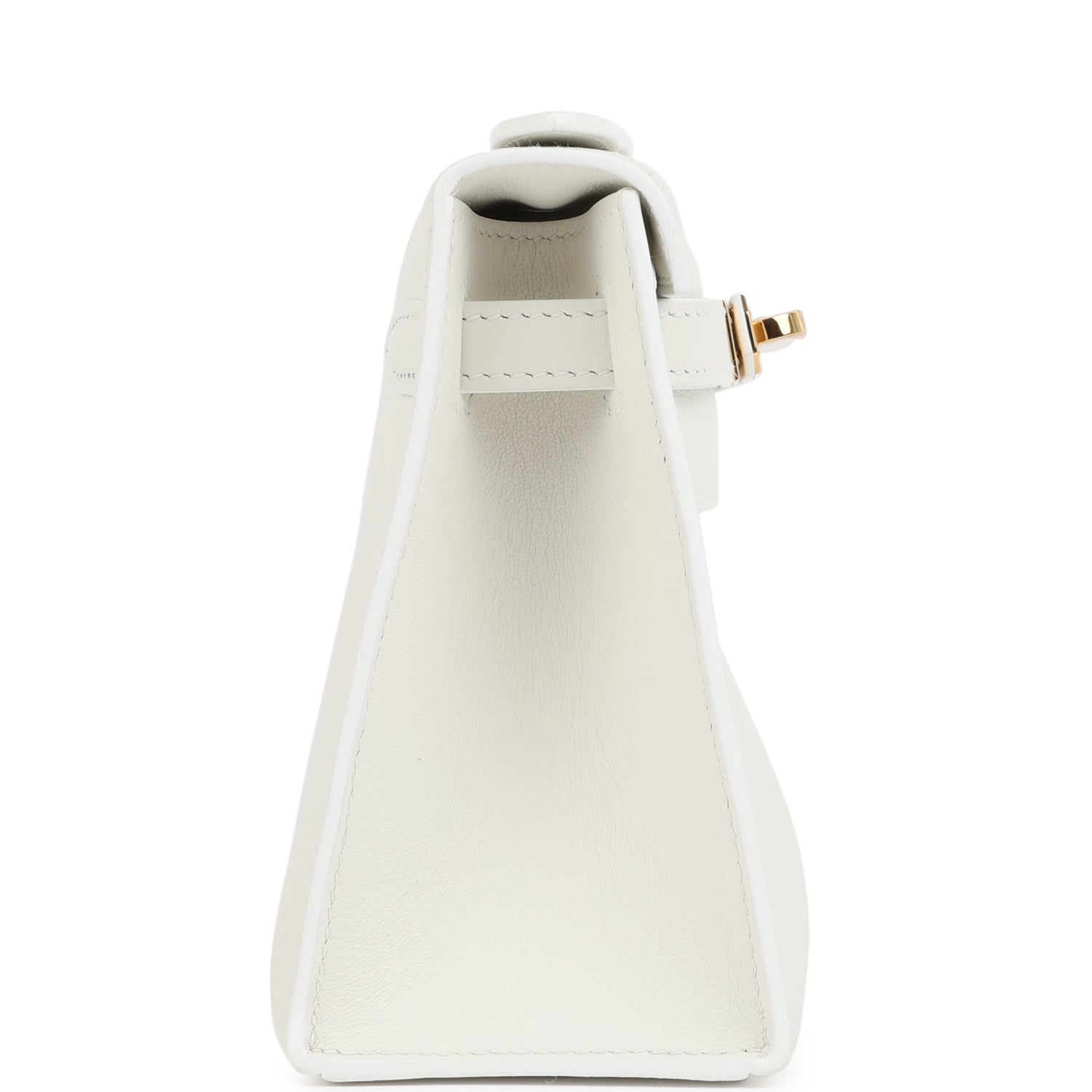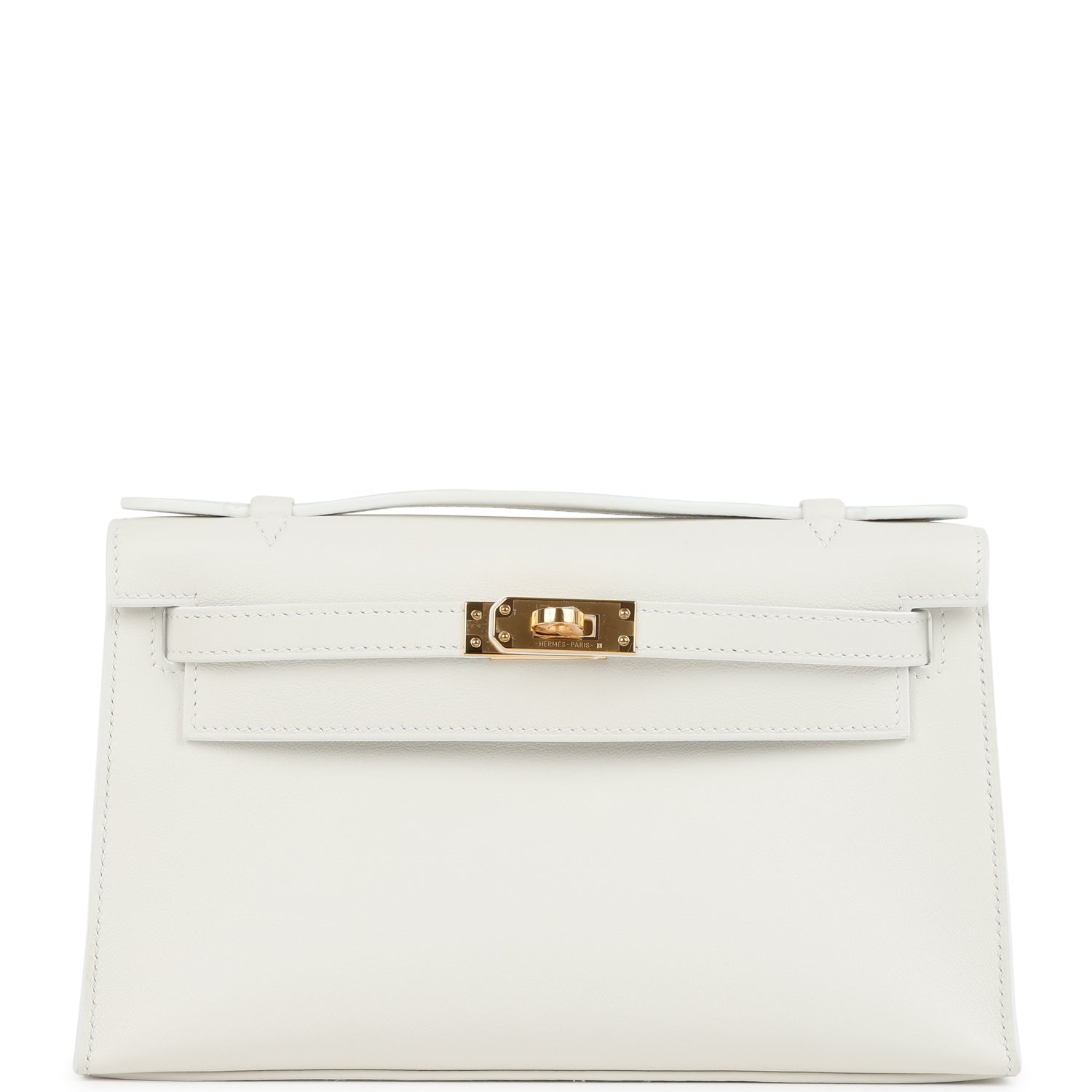This Kelly Pochette is in White swift leather with gold hardware and has tonal stitching, front flap, two straps with center toggle closure and a top flat handle.