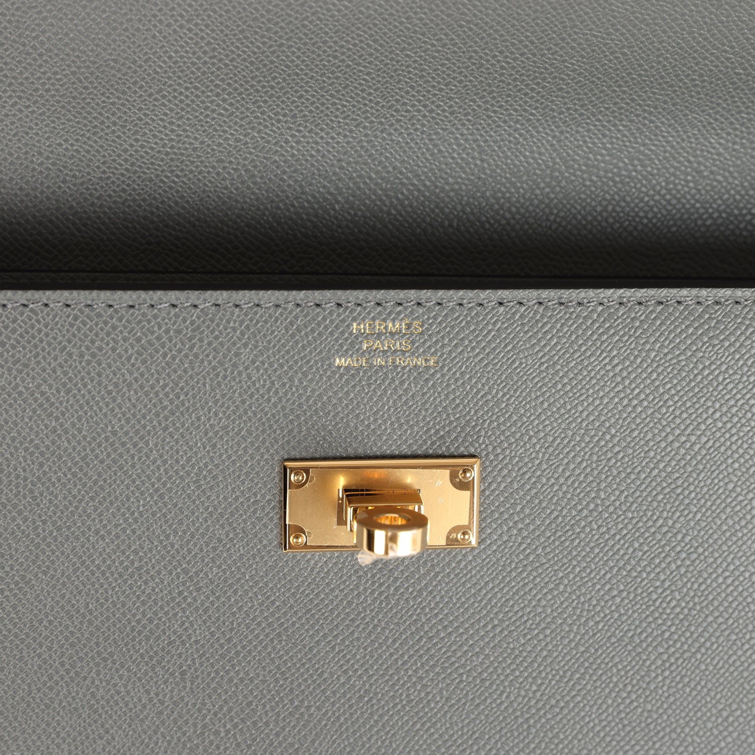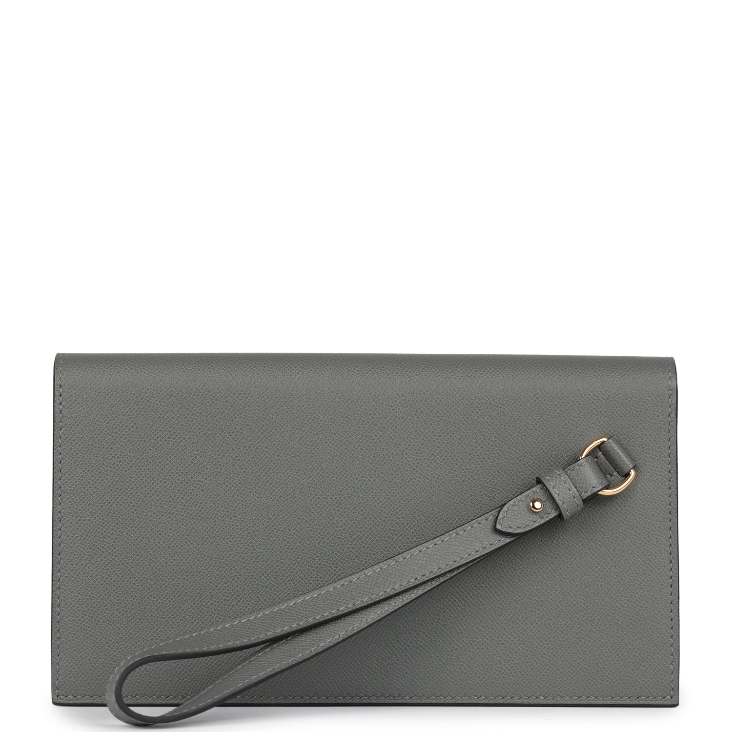 This Kelly Pocket Long Wallet is in Gris Meyer Madame leather with gold hardware and has tonal stitching, turnlock closure and a detachable wristlet strap.