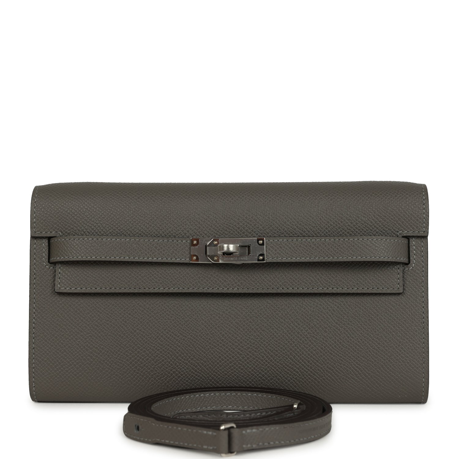 This Kelly Wallet To Go is in Gris Meyer Epsom leather with palladium hardware and has tonal stitching, two straps with front toggle closure and removable crossbody strap.