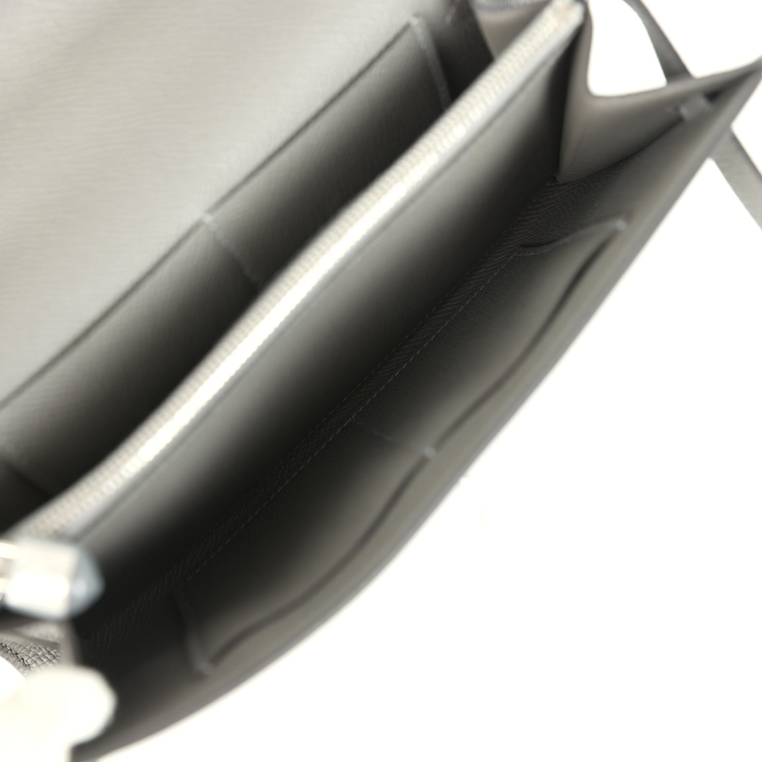 The interior is lined with Gris Meyer epsom leather and two main compartments with four credit card slots and a zippered center compartment with H lock pull.