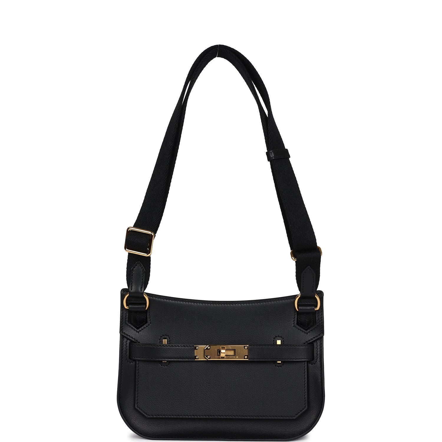 This Jypsiere Mini is in Black evergrain leather with gold hardware, tonal stitching, single flap, two pull straps, turnlock closure, and a flat wool shoulder strap.