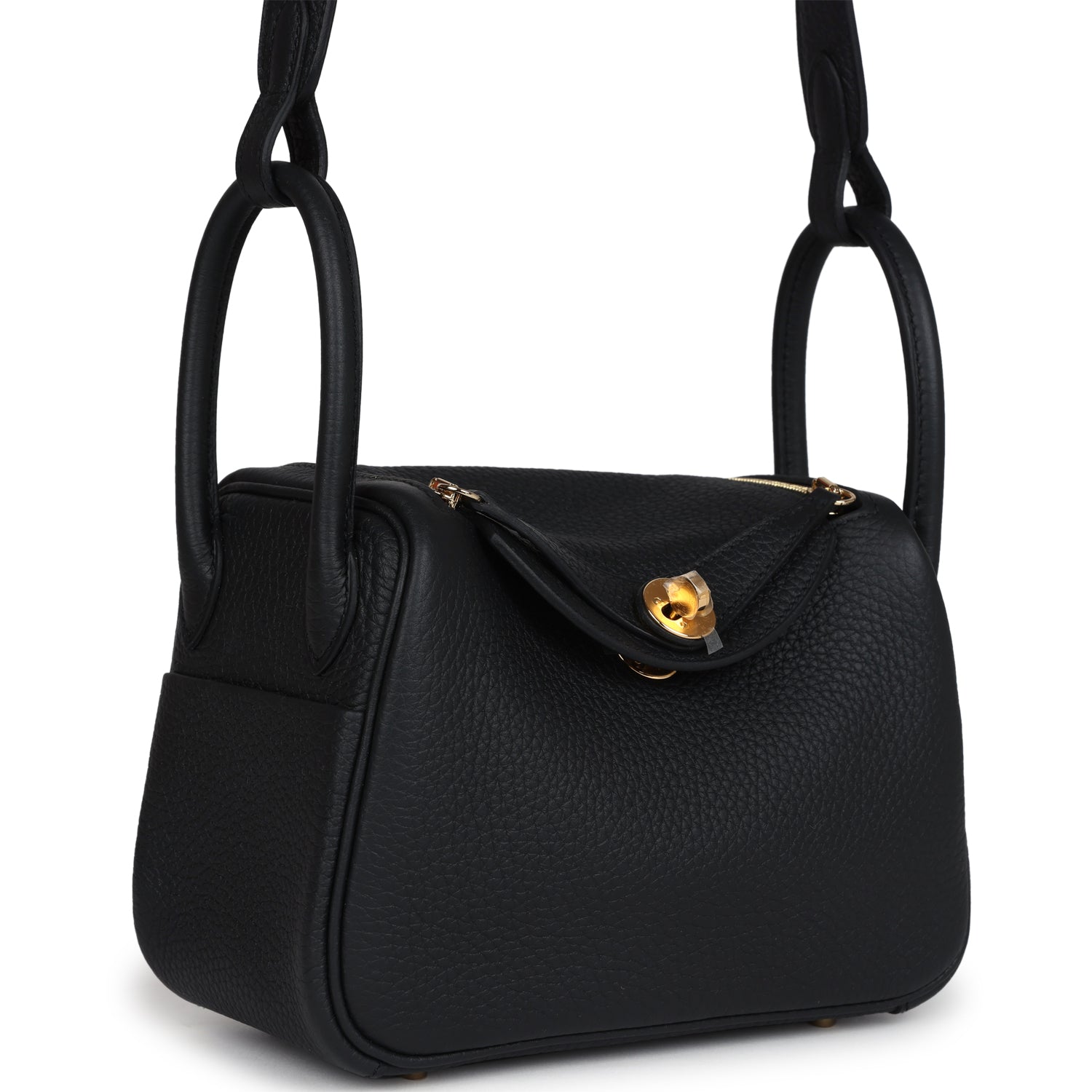 This Mini Lindy II is in Black clemence leather with gold hardware and has tonal stitching, double zipper pulls, front Hermès twist lock, single pocket on each side, two rolled top handles linked by a flat shoulder strap.