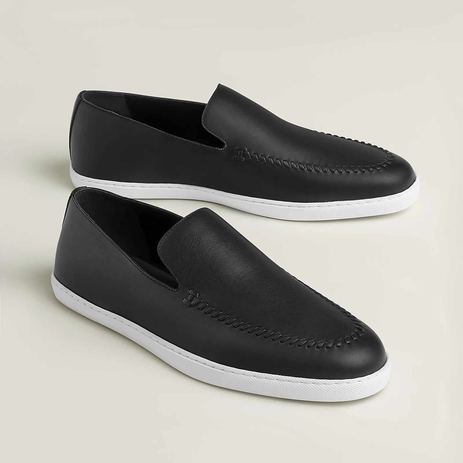 Loafer in suede goatskin with braided leather detail and rubber sole.