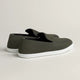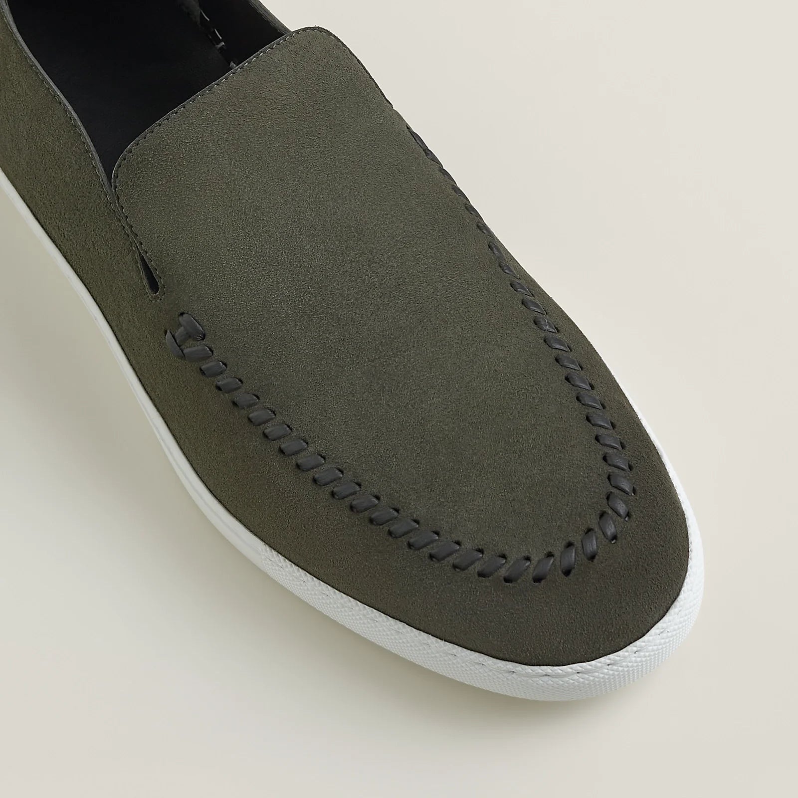 Loafer in suede goatskin with braided leather detail and rubber sole.