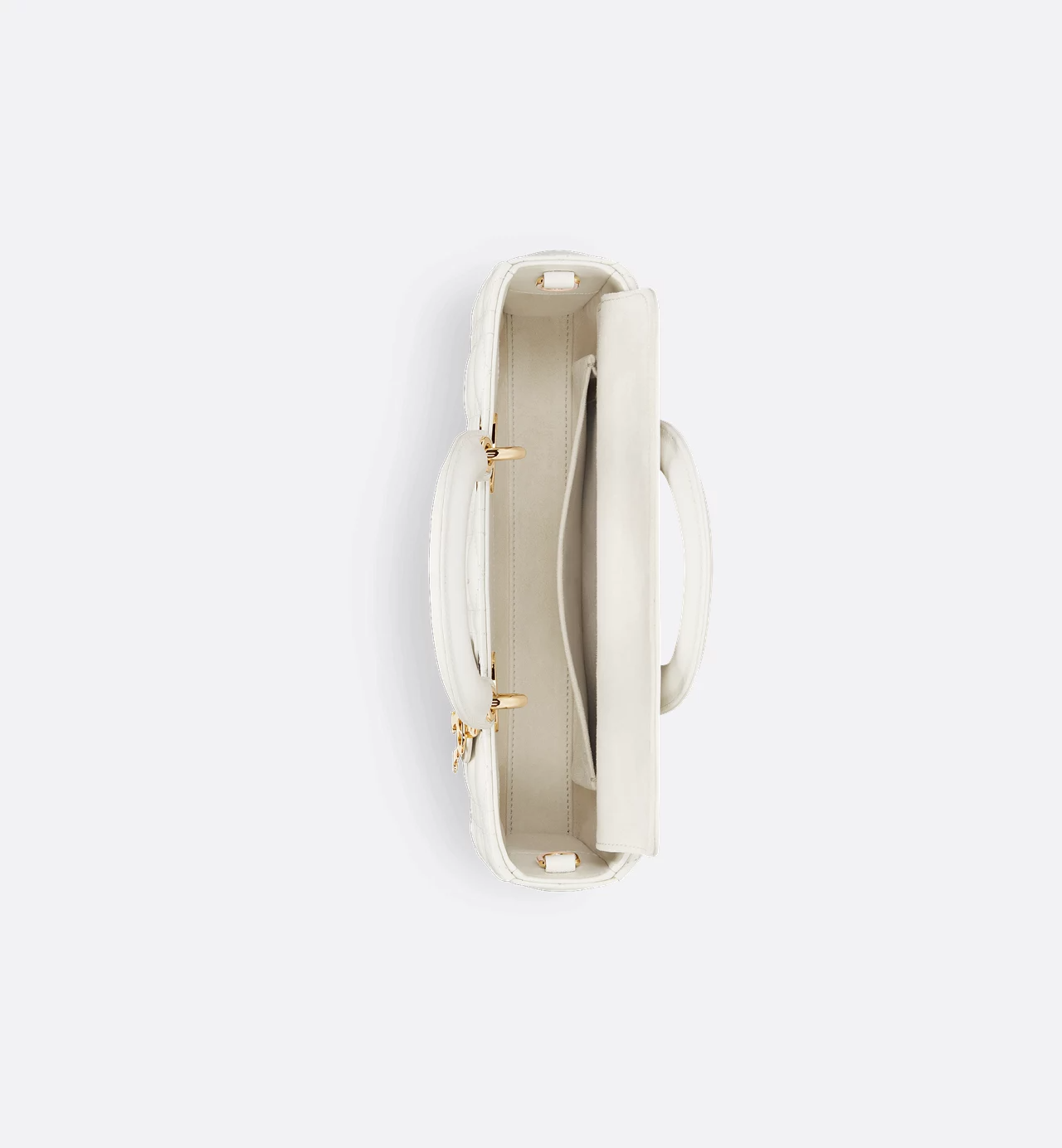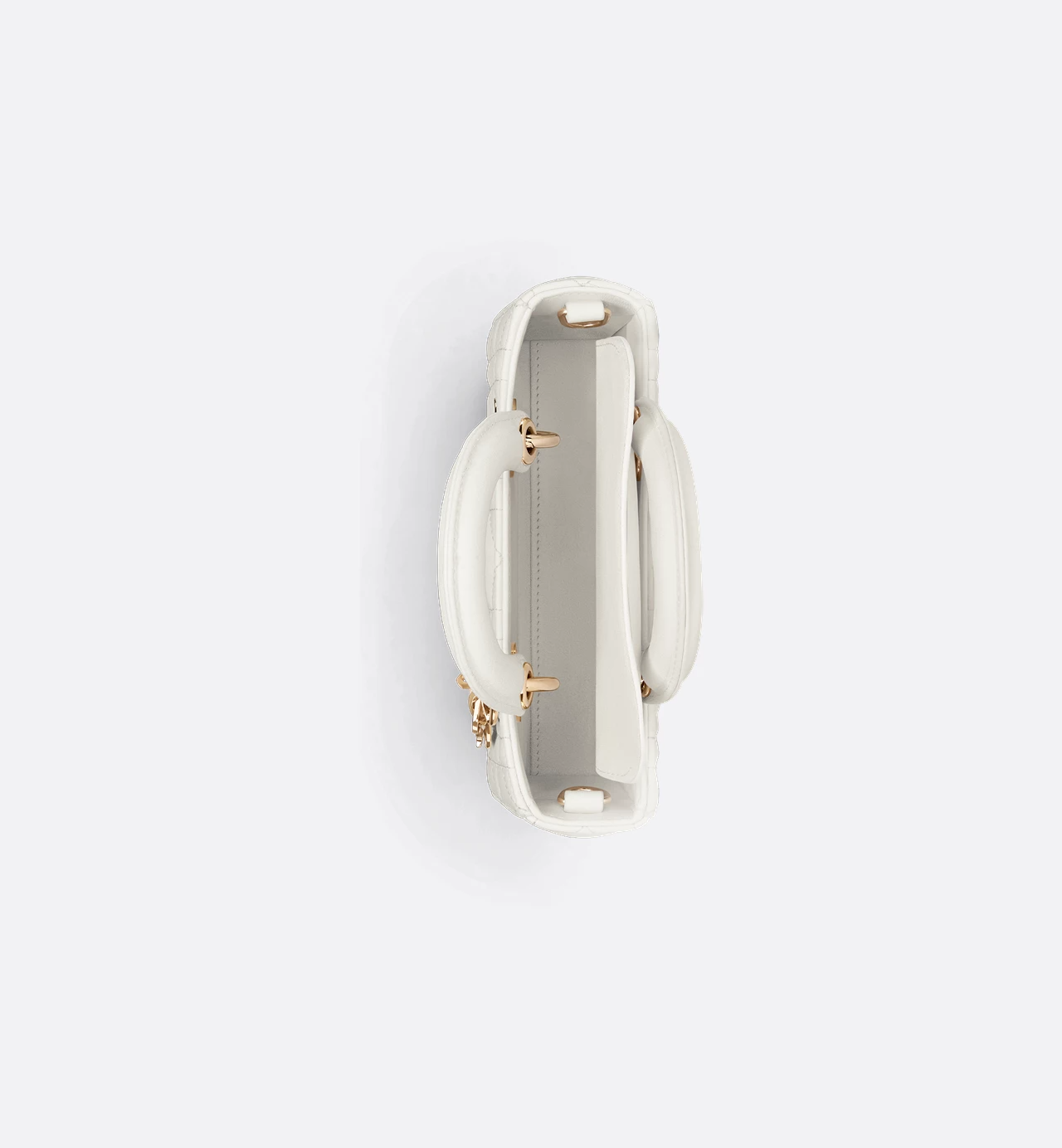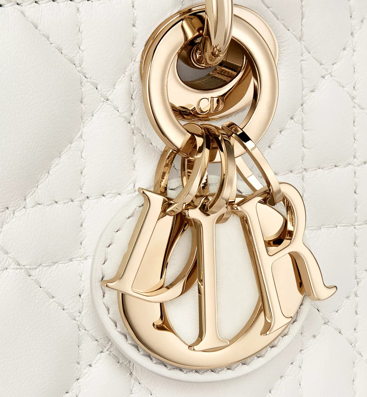 The Lady D-Joy bag epitomizes Dior's vision of elegance and beauty. Refined and sleek, the timeless style showcases the iconic streamlined aesthetic of the Lady Dior line. Crafted in latte lambskin with Cannage stitching, it is enhanced by pale gold-finish metal D.I.O.R. charms embellishing its silhouette. Featuring one removable chain strap and another adjustable and removable leather strap, Lady D-Joy bag can be carried by hand, worn over the shoulder or crossbody as a daily companion.