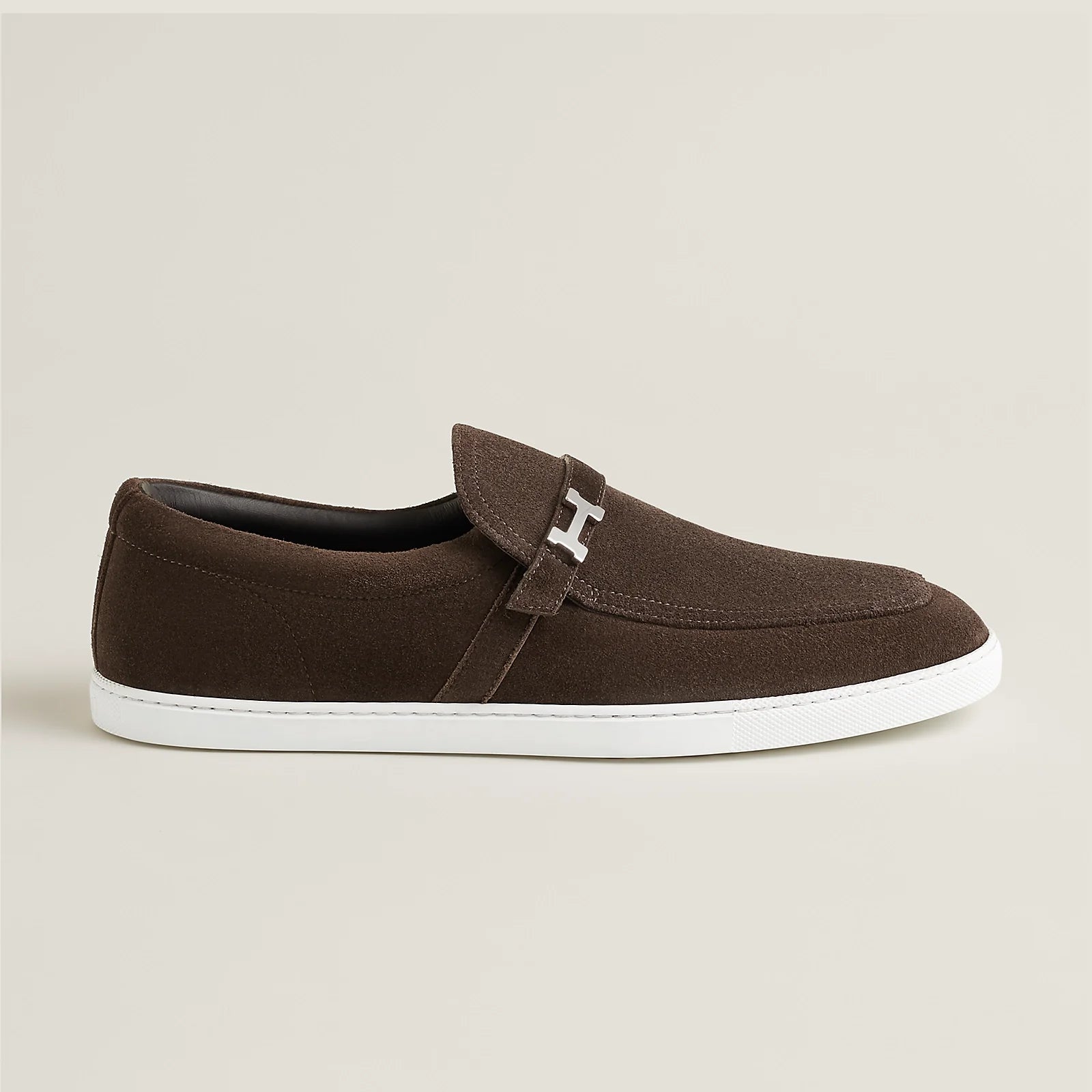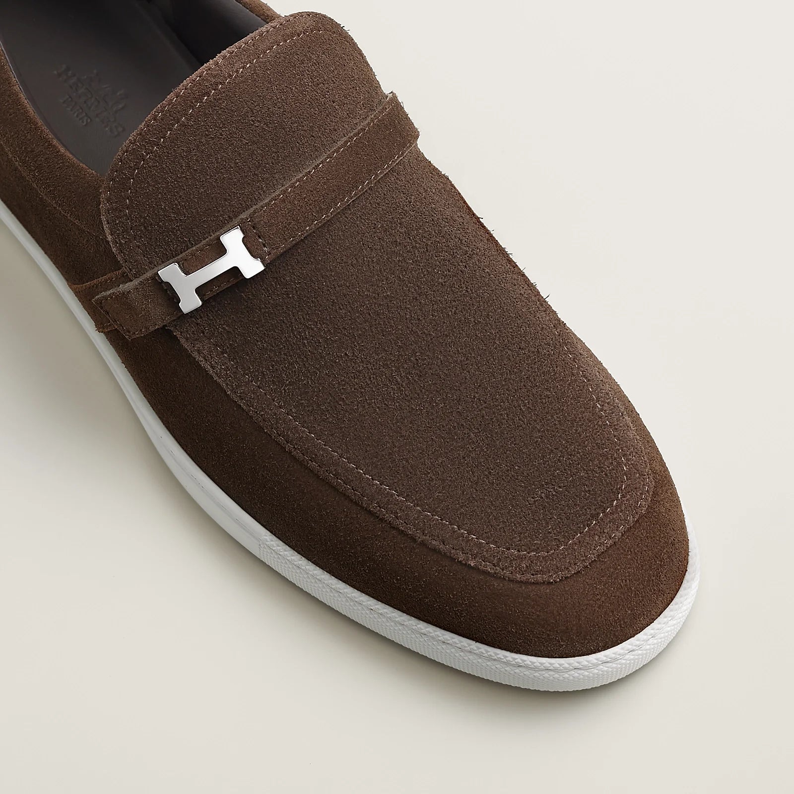 Loafer in suede calfskin with rubber sole and miniature Paris buckle.