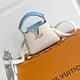 A refreshing take on the timeless Capucines Mini, this edition combines creamy grained leather with a soft sky-blue handle and flap. Finished with a golden LV logo and elegant chain strap, it exudes charm, sophistication, and a playful pop of color ?€? perfect for both city strolls and chic occasions.