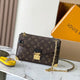 An iconic favorite with a modern twist, the Louis Vuitton Pochette M??tis in Monogram Canvas is crafted to exude structured elegance. Featuring a gold-tone S-lock closure and a refined silhouette, it offers versatile wear with a top handle and removable chain strap. Compact yet roomy enough for your essentials, this bag is perfect for day-to-night sophistication.
