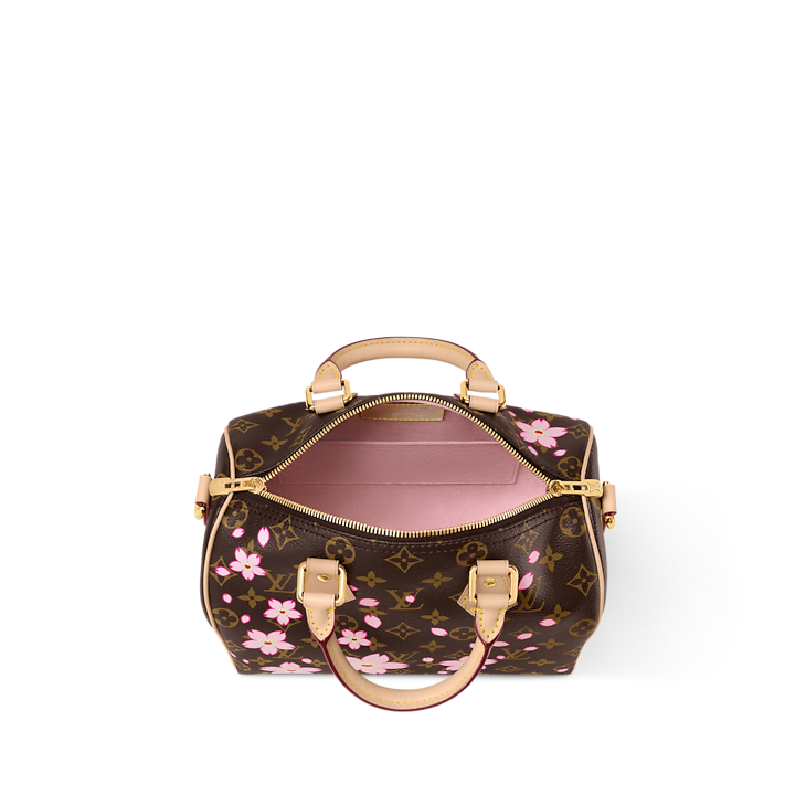 As part of the exclusive re-edition of the Louis Vuitton x Murakami Collection, this Speedy Bandoulière 25 Bag twists the House’s iconic Monogram coated canvas with celebratory Cherry Blossom motifs in the renowned artist’s vernacular playful style, including a removable Cherry Blossom bag charm. The elegant Toron top handles and removable leather strap are highlighted in natural cowhide leather, while a golden double zip closure complete with a padlock ensures personal items are secured.
