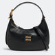 The Miu Miu leather hobo bag features an adjustable leather handle, a detachable, adjustable leather shoulder strap with a maximum length of 115 centimeters, and gold-tone hardware. The front of the bag has a metal lettering logo and a zipper closure. The interior is lined with cotton satin.
