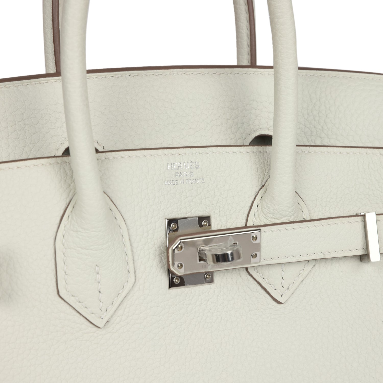 This Birkin is of Mushroom togo leather with palladium hardware and features tonal stitching, front flap, two straps with center toggle closure, clochette with lock and two keys, and double rolled handles.
