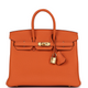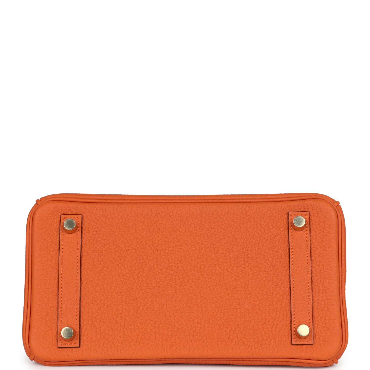 This Birkin is in Orange togo leather with gold hardware and has tonal stitching, front flap, two straps with center toggle closure, clochette with lock and two keys, and double rolled handles.