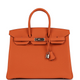 This Birkin is in Orange togo leather with palladium hardware has tonal stitching, front flap, two straps with center toggle closure, clochette with lock and two keys, and double rolled handles.