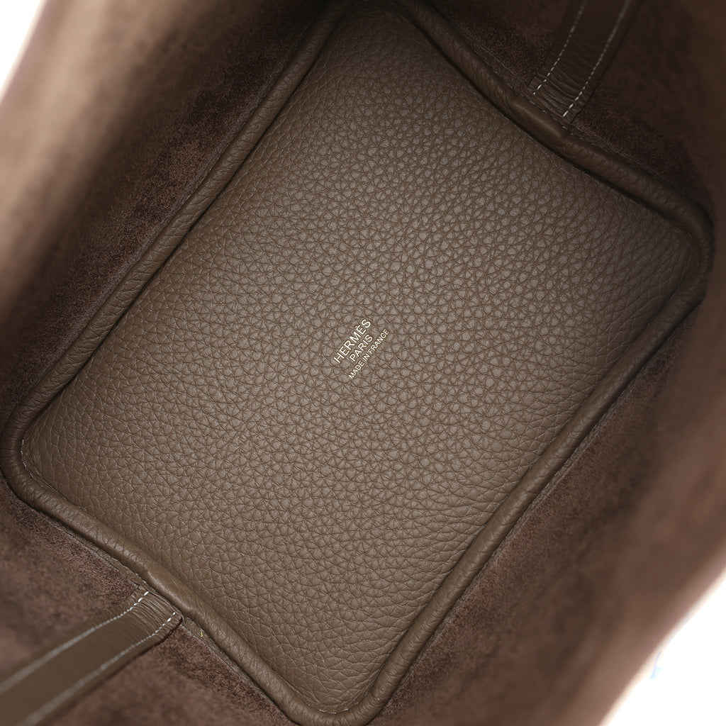 This Picotin is in Etoupe clemence leather with gold hardware and has contrast stitching with two top handles.