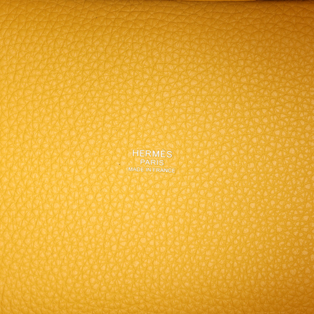 This Picotin Lock is in Sun clemence leather with palladium hardware and has tonal stitching with two top handles.