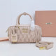 A sophisticated leather handbag featuring a signature quilted texture and metallic logo accents. Designed with dual handles and a detachable strap, this bag offers both style and function. The matching logo tag adds an extra touch of detail for a polished, modern finish.