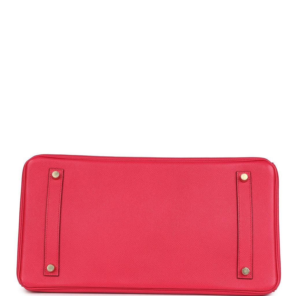 This Birkin is in Rose Extreme epsom leather with gold hardware and has tonal stitching, front flap, two straps with center toggle closure, clochette with lock and two keys, and double rolled handles.