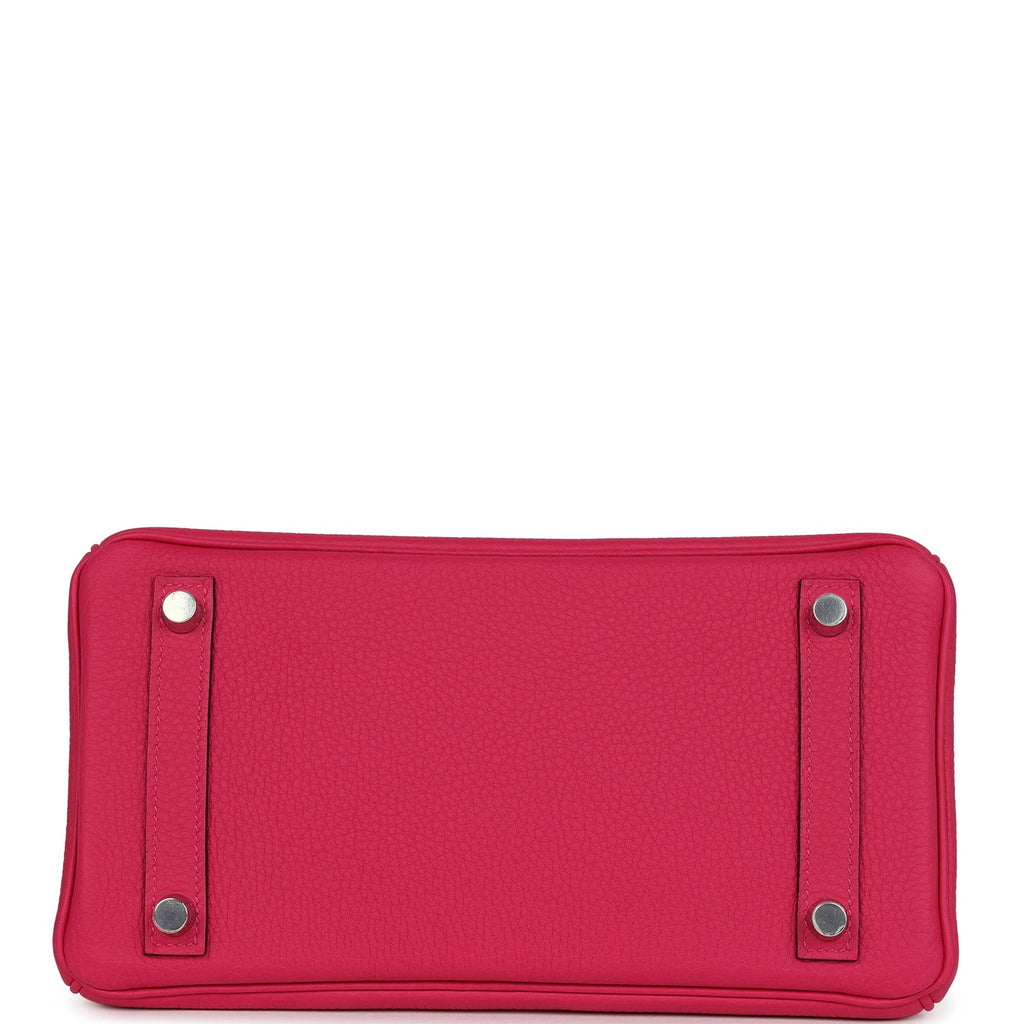 This Birkin is in Rose Mexico togo leather with palladium hardware and has tonal stitching, front flap, two straps with center toggle closure, clochette with lock and two keys, and double rolled handles.